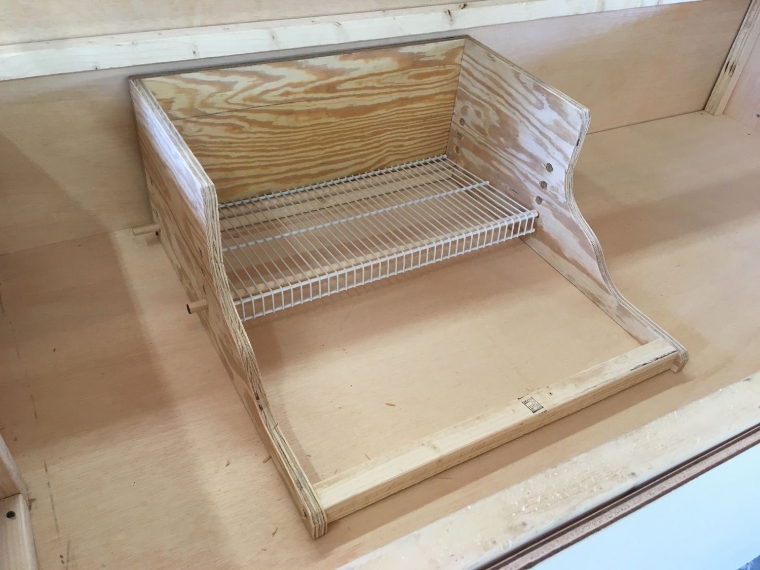 Ok, I tried to put something together based on perchie.girl's drawing from a ways back. Here are a few picks. Haven't actually tried it out but looking forward to in probably less than a week... Dowels can be adjusted to different heights as the chicks get bigger. And it fits nicely in the new brooder we just built.