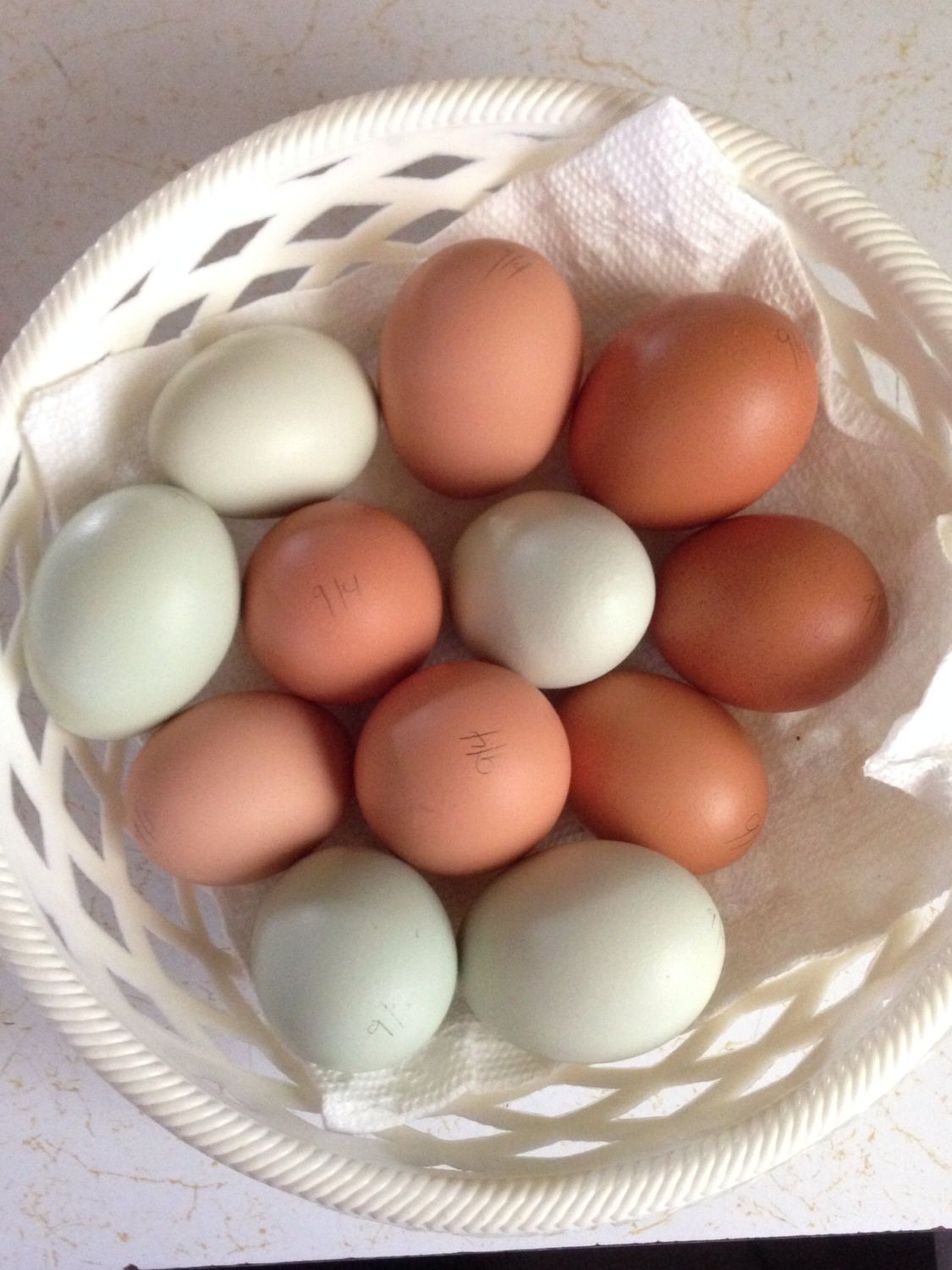 I have some that are a kind of blueish green...more blue than greenish though, and Aggie lays the prettiest blue blue eggs. Sometimes it's hard to get the blue to show up in photos, as anyone who has tried it can attest, but I don't have any green layers out there. Hope that the Olive Egger in the incubator hatches.