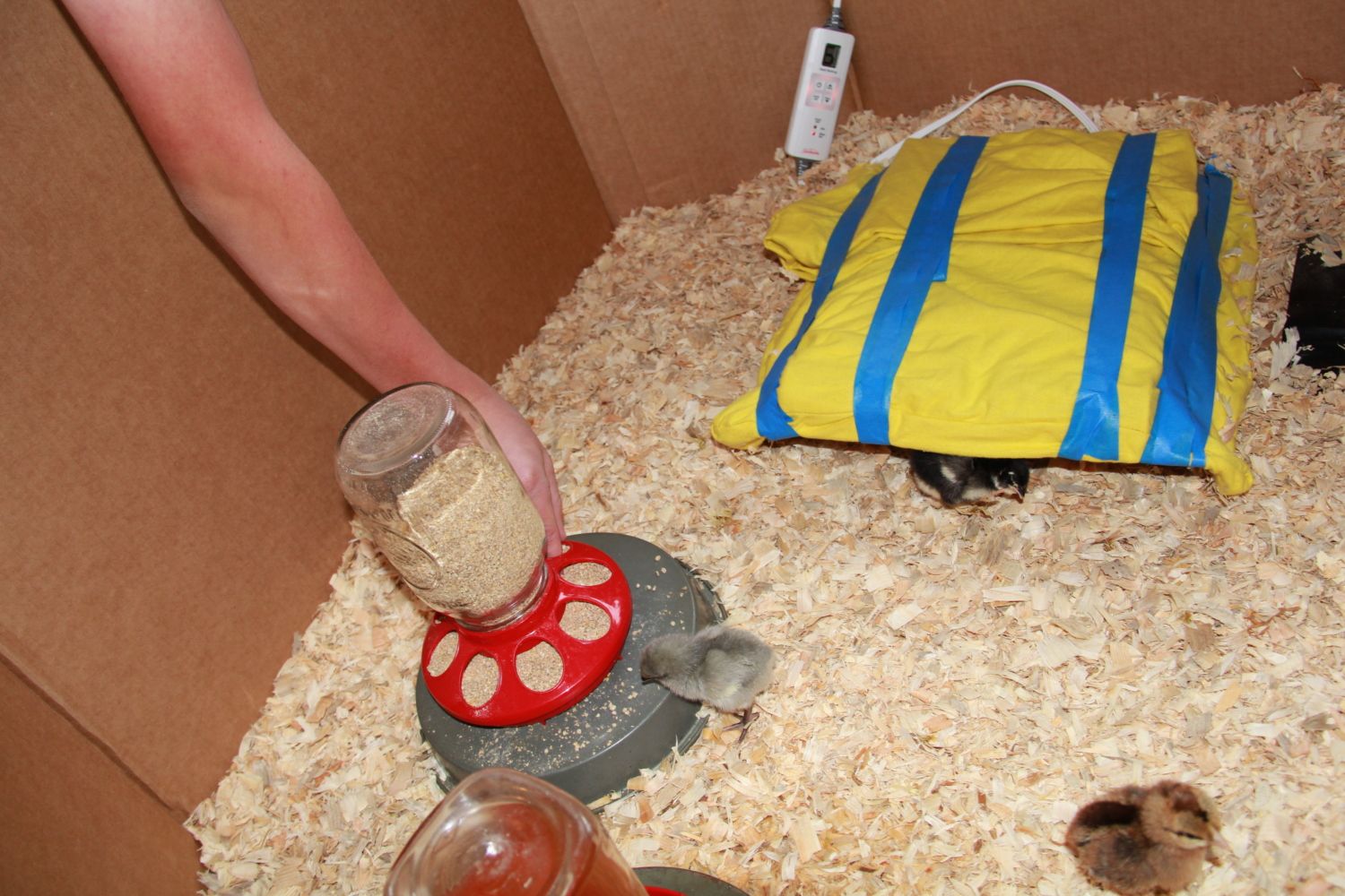 When I started this journey of deciding I wanted chickens, I did TONS of reading and asking questions on this site. I took ideas from several folks and hubby and I built a coop that works for us. Just as I took several ideas and incorporated them into this brooder I now have. I did start out with feather dusters hanging in the brooder for the chicks to snuggle under ( only due to the MHP being out in the coop and set up ) , but within hours I took those out and brought in the MHP.