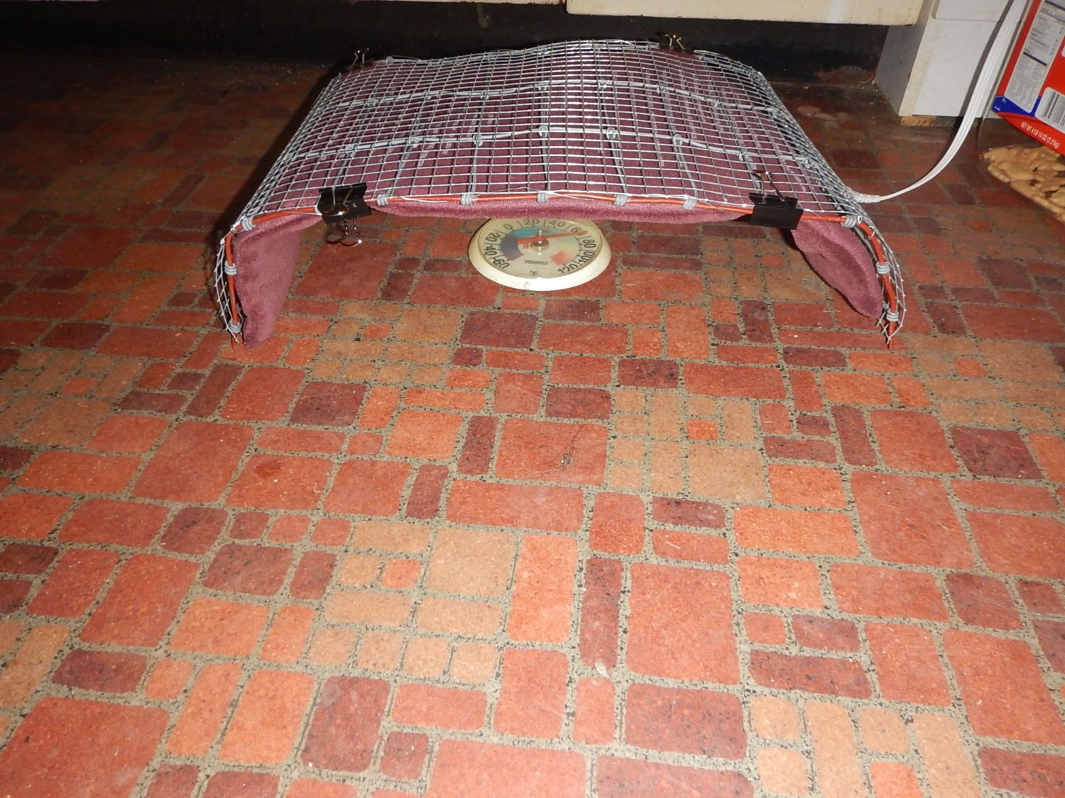 Woods, if you wish to test heat that pad, I'd place that thermometer right up against the heating pad, for that's where the heat is truly measured and where your chicks will be feeling the heat. They won't get much radiant heat from where your thermometer is located in these pics.