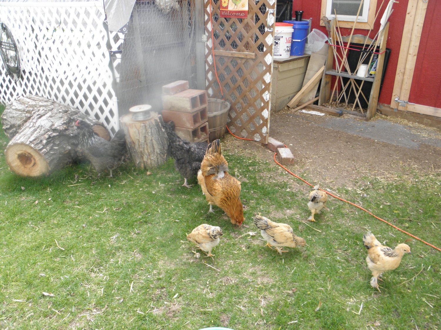 I ran out and gathered up the three chicks outside in the grow-out pen and brought them inside and then put all five chicks into a foam cooler. Then I started up the propane stove and got some rain water brought in from the rain barrels and started it heating. When it was warm enough to still stick my hand in and not get burned, I poured it into several quart plastic bottles and placed them in the foam cooler with the five chicks.