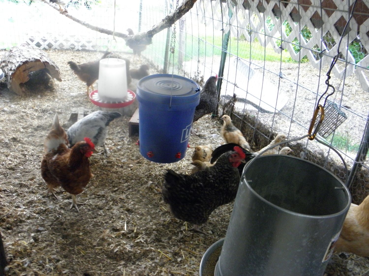 The chicks were going nuts out in the run while I was setting up their cave in a crate in the garage, not only because they were feeling stranded and cold, but it was the first time they had ever heard heavy rain hammering the roof of the run. They came right to me when I called, "Babies!" And they immediately quieted down when I popped them into a small cooler for the wet trip back to the garage. They scooted right under the already warming heating pad and started their bedtime trilling.
