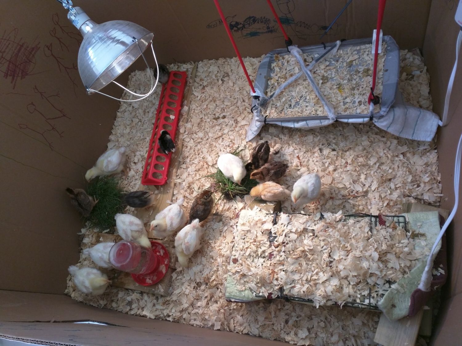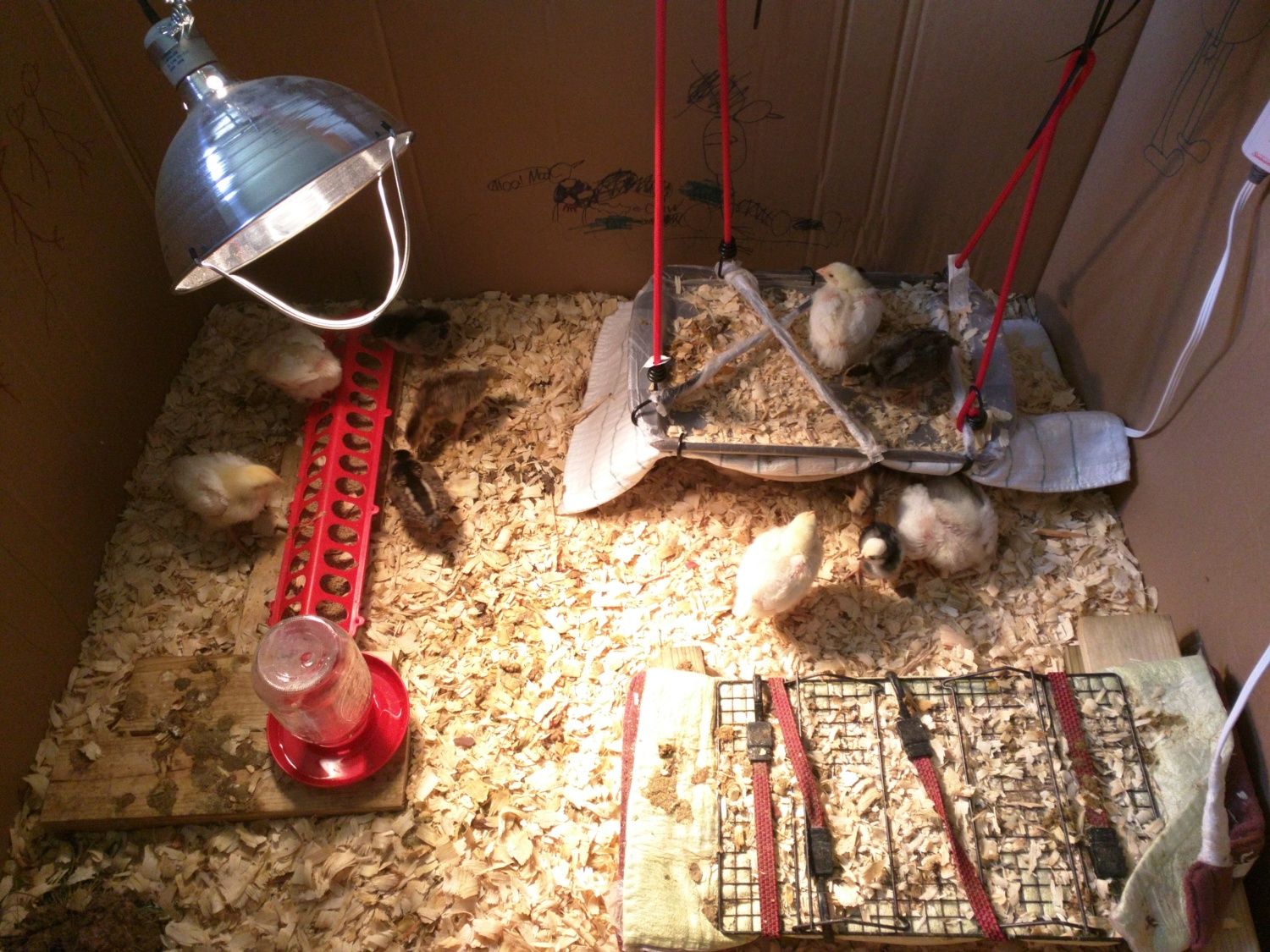 I added an extra MHP a bit higher for the meaties, it's bungee corded onto the bottom of a cookie sheet with press n seal on top of it (they don't slip). The towel between the MHP and the cookie sheet is completely covered on both sides and all edges with press n seal. It is just there to protect the top surface of the pad from poop because they love sitting up high and pooping on the pad below. It is very redneck and not so glamorous but they are happy under there and most of the chicks sleep under there now. It was warm last night (52) so I left them at heat setting 3 and they were all happy. During the day they are on 3 as well. Cold nights they can go up to setting 6 if the temps drop to freezing but as they feather out I won't go that high for much longer. Most nights will be warmer now.