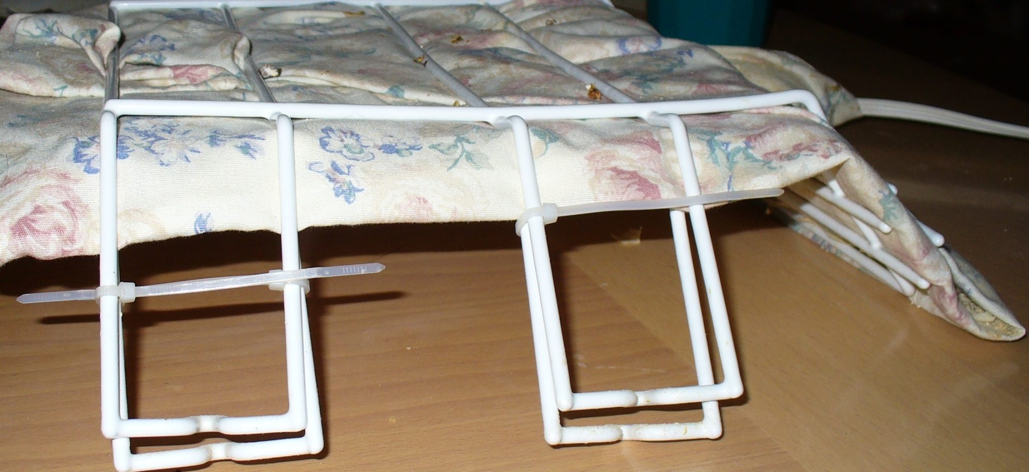 We had a similar issue (though very short lived, thankfully) so here's our 2nd evolution of the MHP. We used two racks- the kind you buy for your foil and saran wrap and wax paper to mount onto the inside of a kitchen cabinet door. Naturally we bent it into the desired shape. To prevent the stuck chick problem, we put one rack on the bottom. Then in the middle, the heating pad wrapped in an old pillowcase, and on top, another rack. Then we zip tied those racks tightly together, so tight you couldn't get a fingernail between the racks and the pad, much less a little beak and neck.