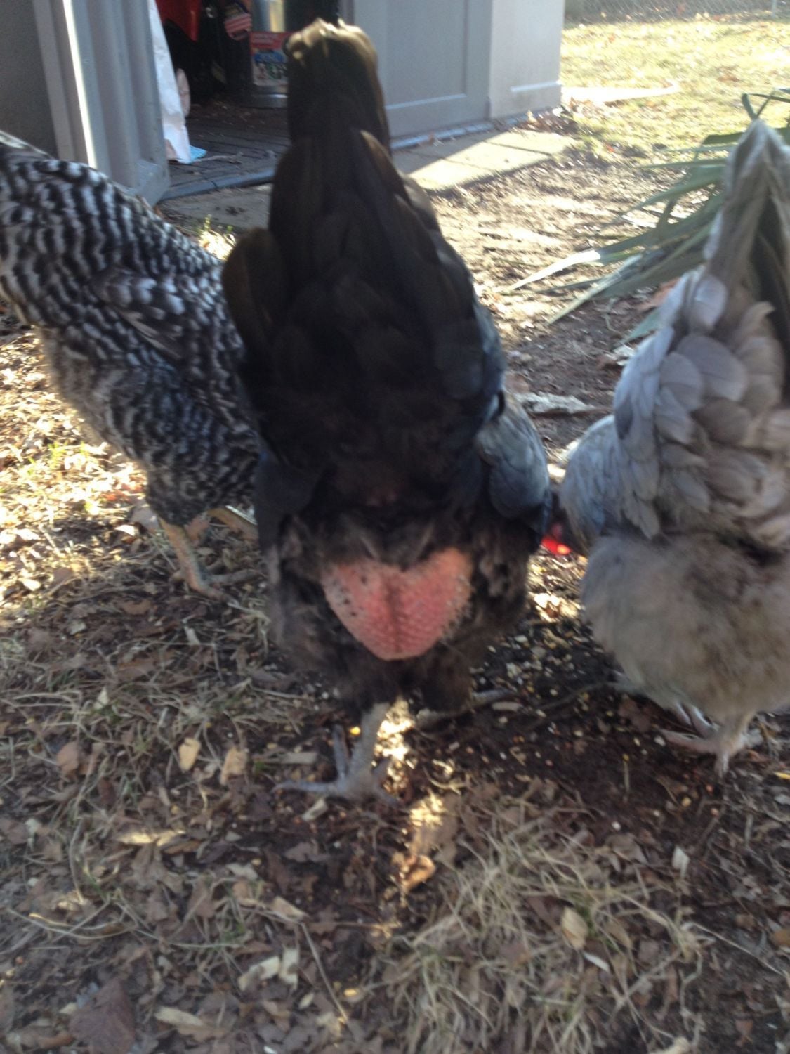 A few weeks ago, I noticed that her bottom was bare of feathers. Soon her legs started losing feathers, too, and tonight I noticed her upper chest has a large bare patch.