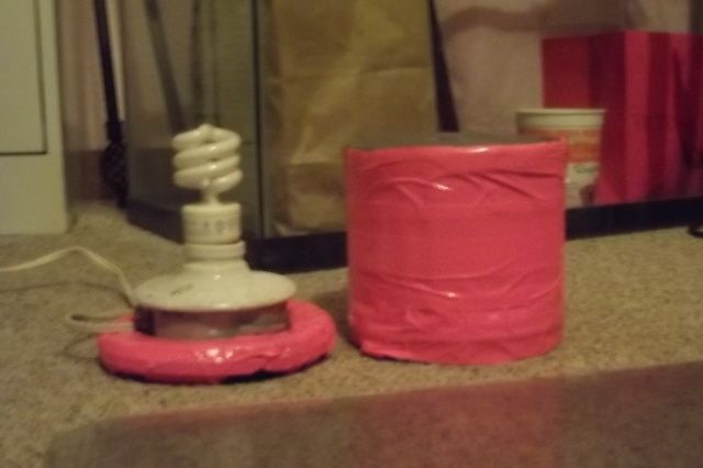 ) and cut a hole in the end of the can a little bigger than a quarter. Used a lid from a large folgers can because it is not as flimsy as the Yuban lid and cut out a piece of rigid stryo insulation with a hole in the center to fit into lid for light to sit into. Made an access cut for the light cord to come out of in the can. We used a basic ceramic light fixture an old metal workbox (a junction box like you would put in the ceiling to wire your light fixture to) Used a small 10 or 13 watt CFL I think, (must be a smaller CFL because the larger ones don't fit with the can back over it) The can snaps down onto the lid and I can sit it on the table and candle. If I could have done something different I would have made it sit on it's side somehow because I tend to hold it over on it's side to candle so that I don't have to turn the egg upside down.