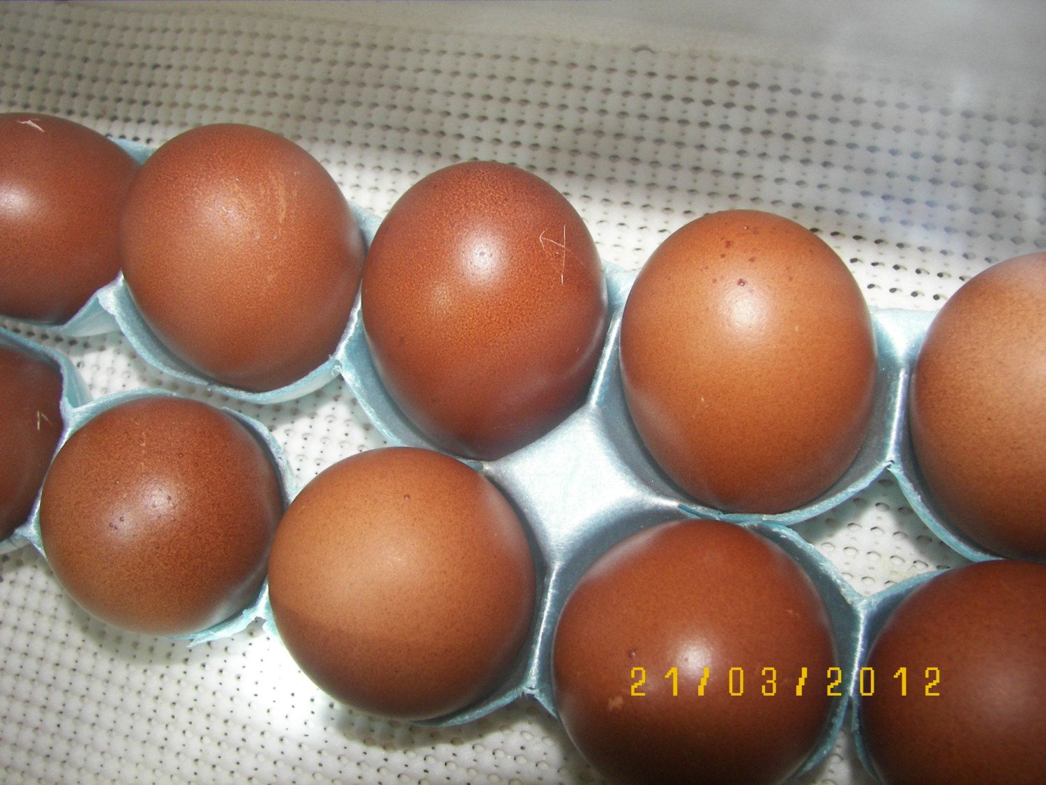 also wanted to say- I've got 15 more BCM eggs (really dark ones this time!) in the bator on lockdown- day 20 today- and 3 are pipped already! I think 2 are clear or have bloodrings- but they're still there due to the shells being SO dark I couldn't see clearly enough to justify tossing them. ( the pips on these dark eggs look amazing!) This pic shows 2 of them- with my flashlight and the camera flash on to show....the eggs look darker without the flash tho. I need to get an egg color chart...