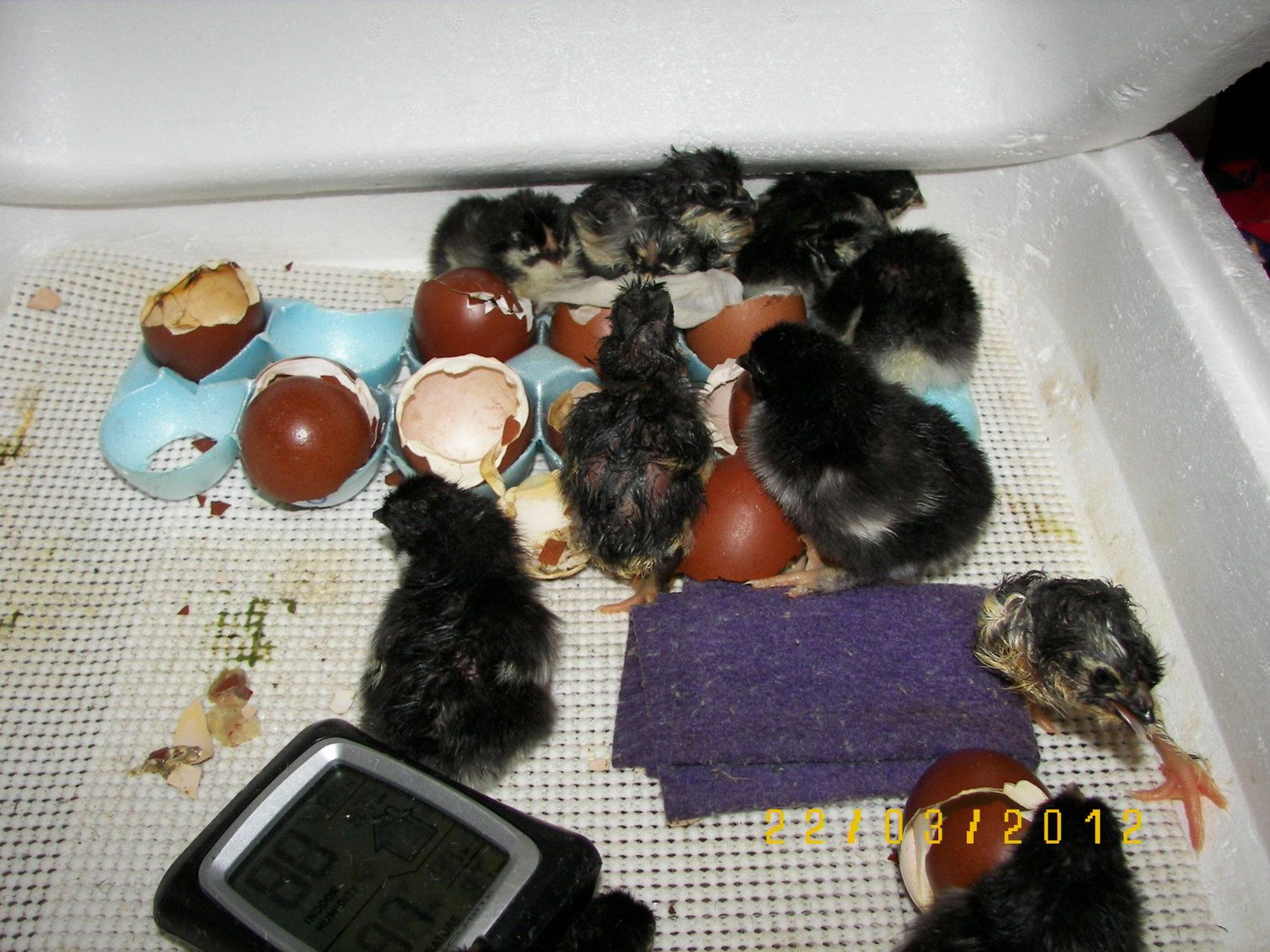well 12 little BCMs hatched. I did help 1 or 2 out...for some reason, even though I never opened it after lockdown, they didn't progress and I could see them weakening. So they're all doing great except 1...who lays on it's back alot and cheeps, flails its legs...etc. Time will tell- but here is a pic for now. Please xcuse the mess...they're in there til tomorrow...