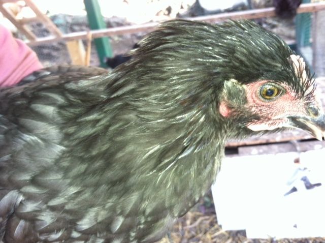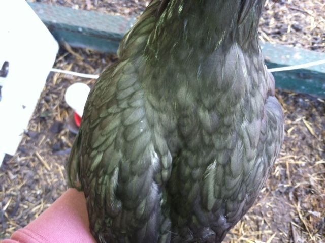 Ok I need some help. Here is a lil girl from my bunch. She is supposed to be black I believe. But she does not have the green sheen to her feathers. They are dull more like a blue but I have counted my chicks and all my blues are accounted for. Could there have been a mix up in labeling? She has one copper feather that I can see in her hackles.