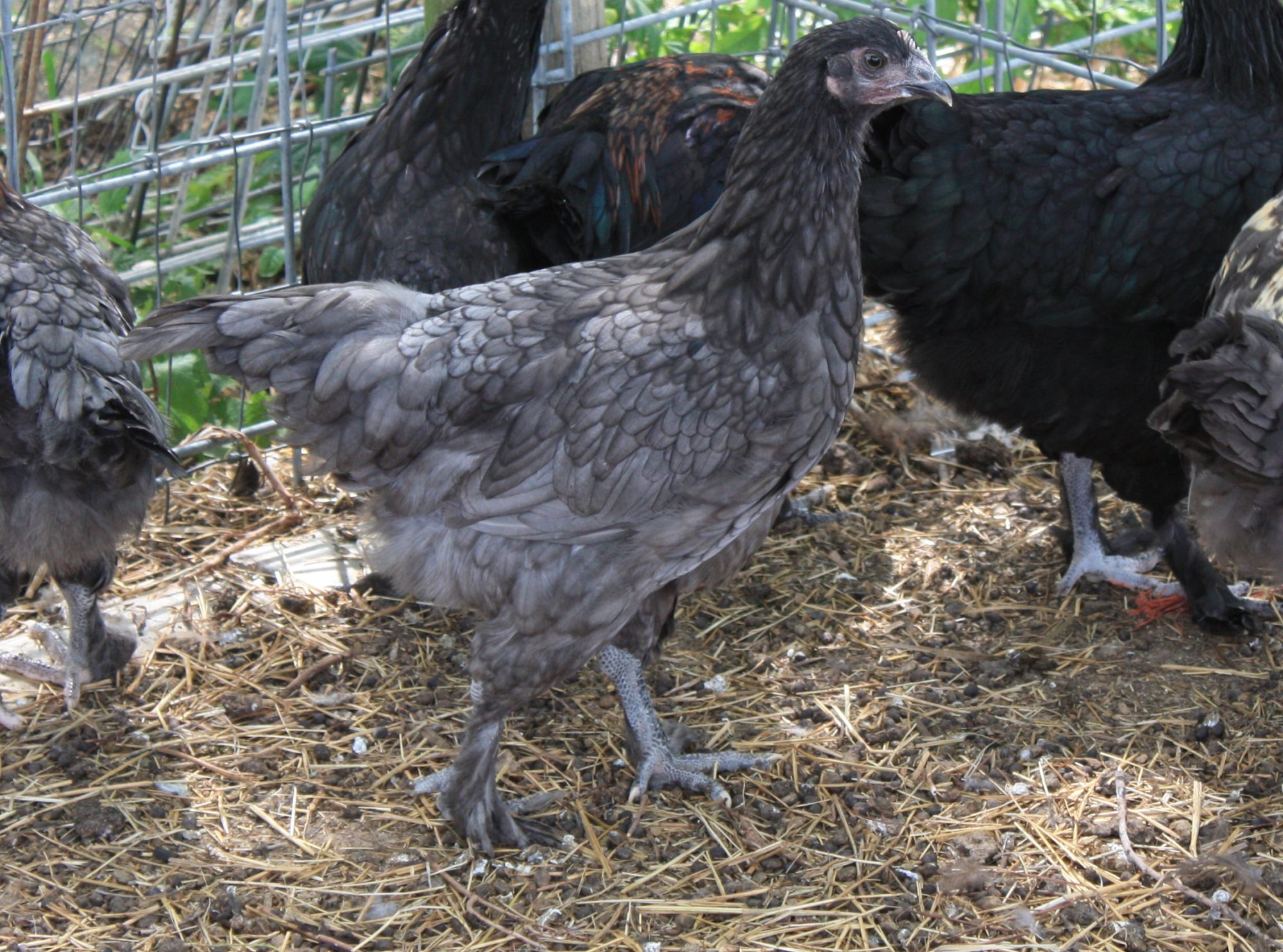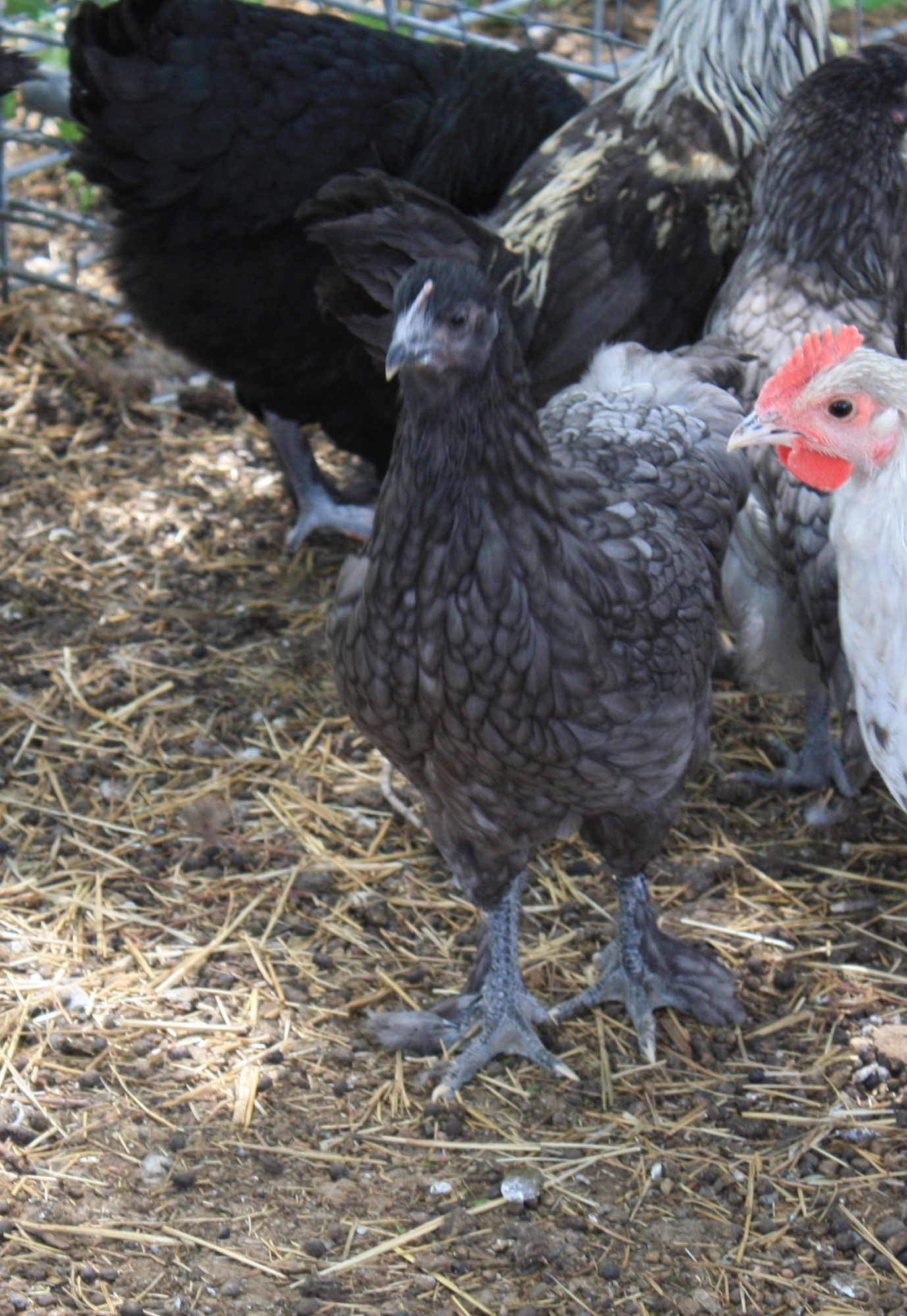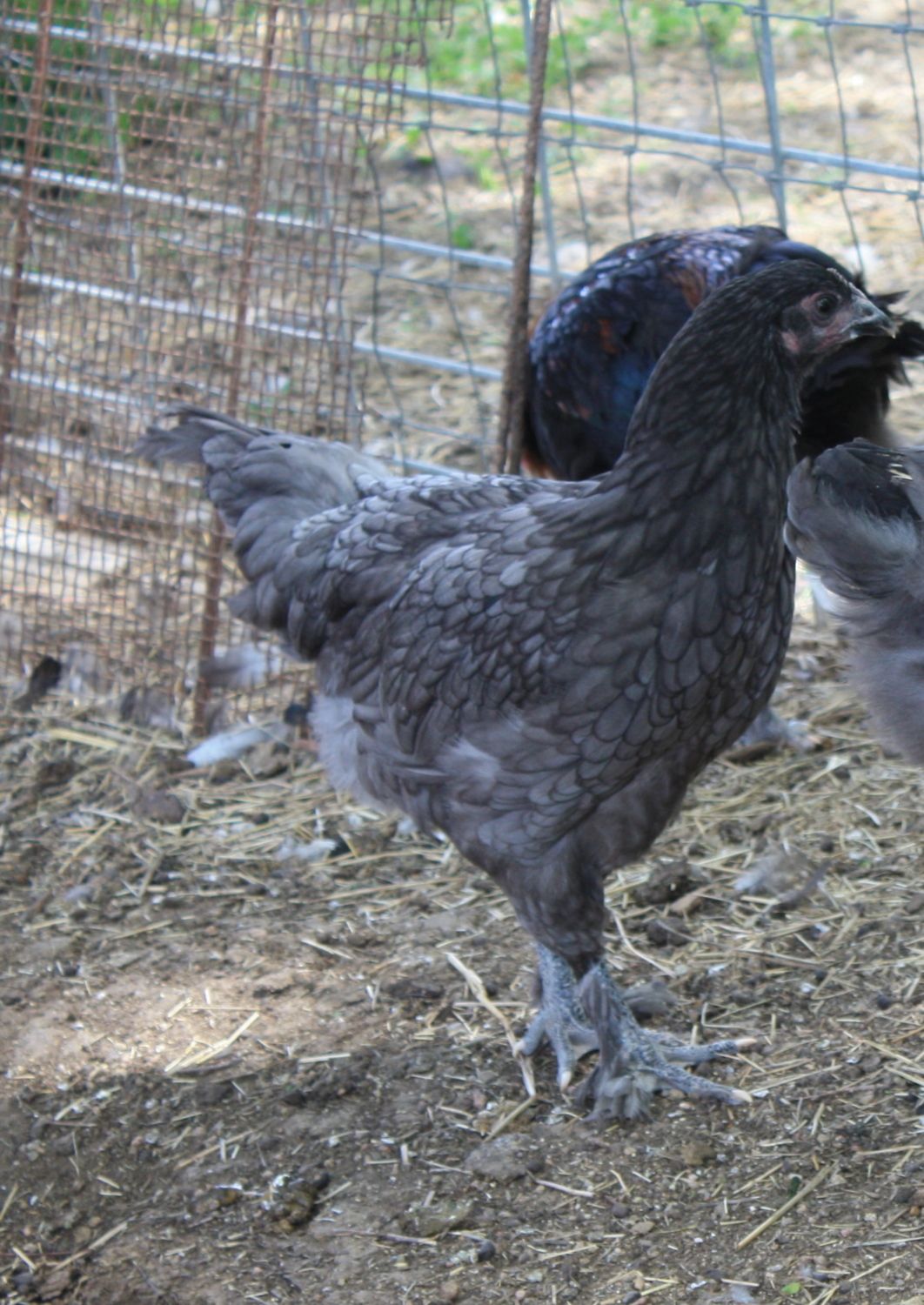 This Blue Cpr pullet does have leg feathering....lightly feathered at that and not street sweepers, but it is something to work with. I suspect she will be very dark once matured. She was very very light pale blue when hatched. I was for sure that she was a he for about 2-3 weeks after hatch, but I was pleasantly relieved.