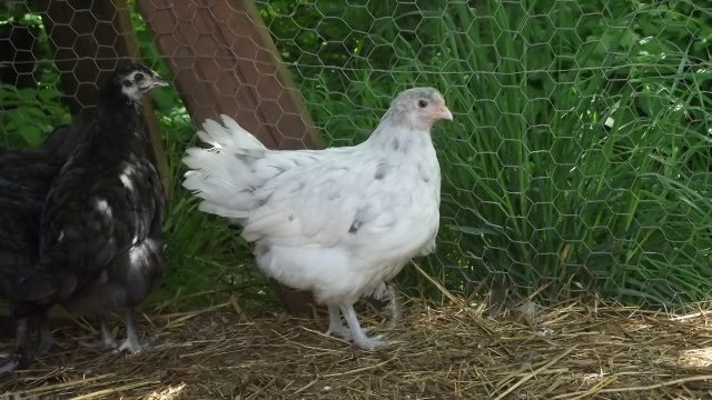 Here is the other little Splash pullet. Now it may look as though she is clean legged, but she is not. Don't know what happened but she hatched with nicely feathered shanks and now only has stubble. Notice how much lighter and more pale her leg color is in comparison to the other Splash pullet.
