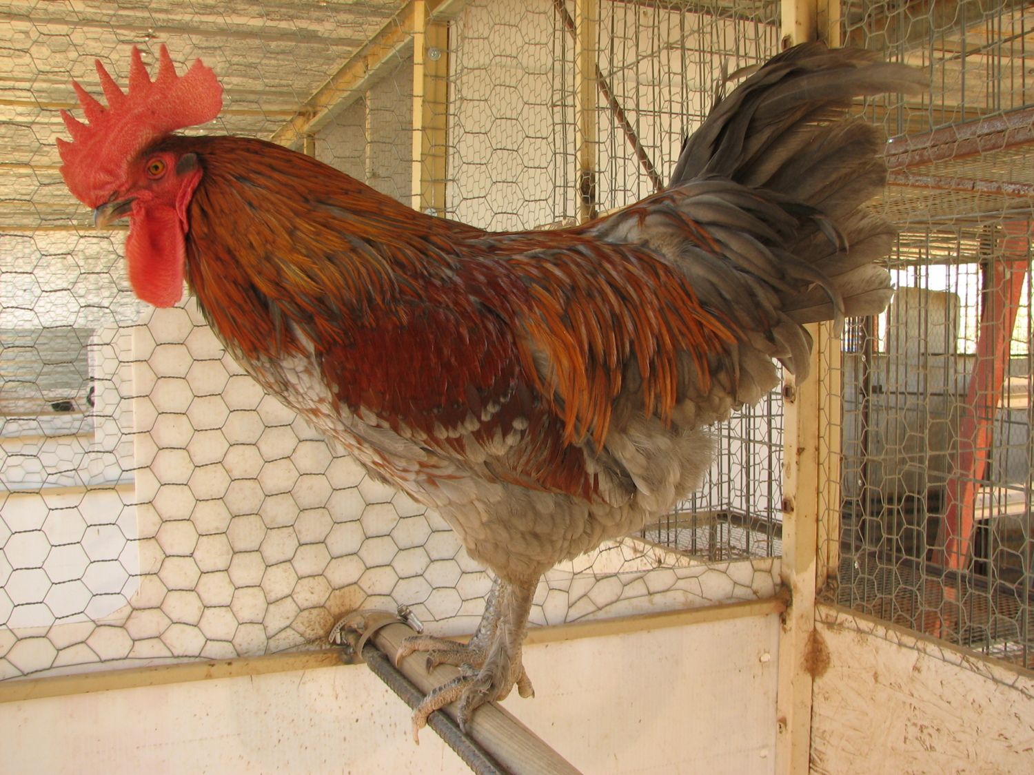 If I needed the pen he would be gone. He is just not right.I finally got around to taking more pics of this "Blue Copper" Marans cockerel, he is 6 months old. If he is pure blue, then his wing triangle should be blue, is that right? So what do you all think? I am trying to breed pure blue coppers, so if he doesn't fit the bill---he is up for grabs if anybody wants him or freezer camp. I don't have the pen space for any test matings with him, although I do think he is pretty and so far he has not been too much of a PINA, although he did beat up his Delaware pen mate, even though they were raised together, and bloodied the Delaware's comb and head--so I had to separate them.