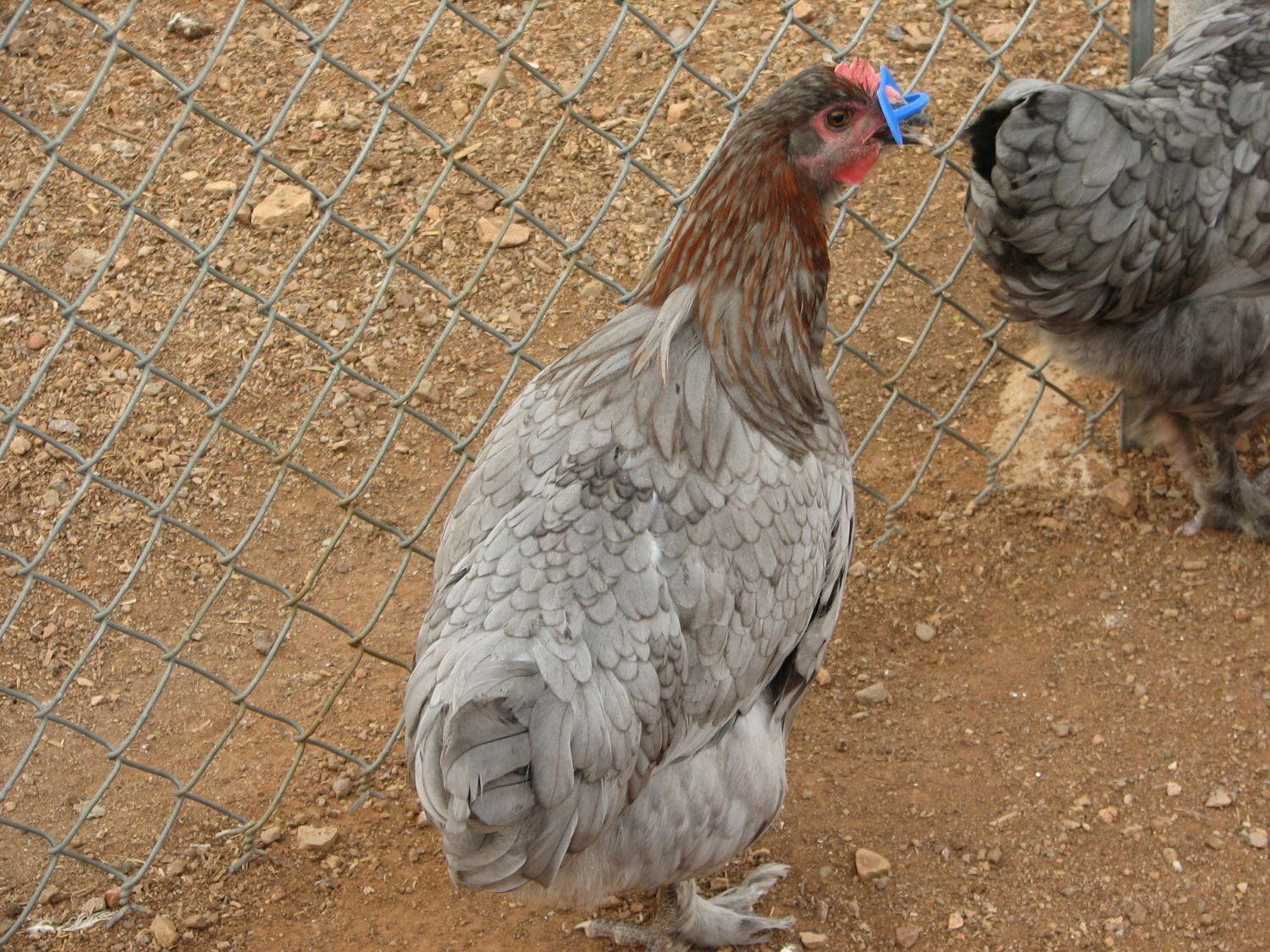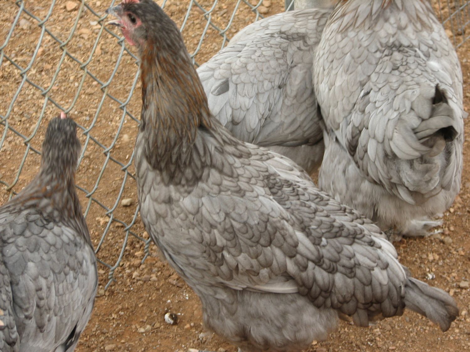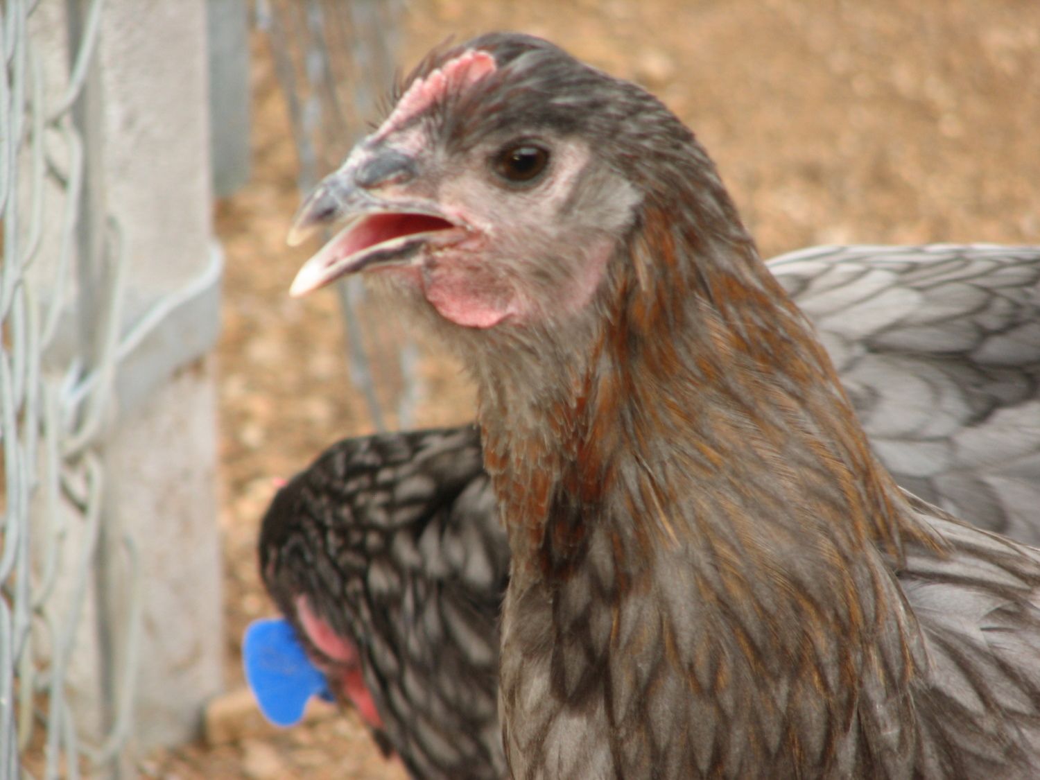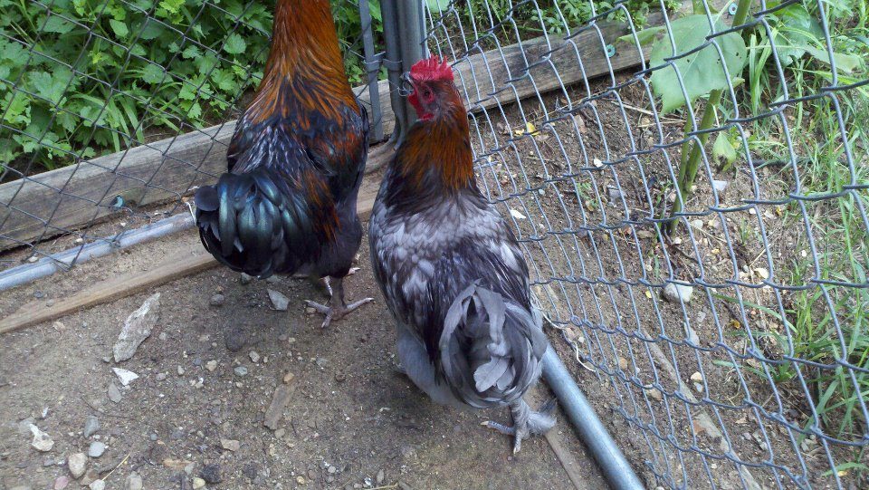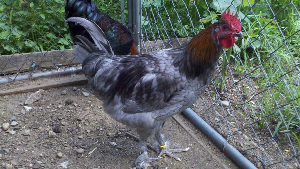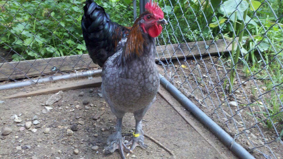 Here are the two Blue Copper pullets I have that have the most copper hackles. Still not enough, IMO, and both are too light in color with poor lacing. But both have the correct eye color. I went through all 7 of my Blue Copper pullets a couple of days ago and made undated notes and checked for sprigs again (none found
