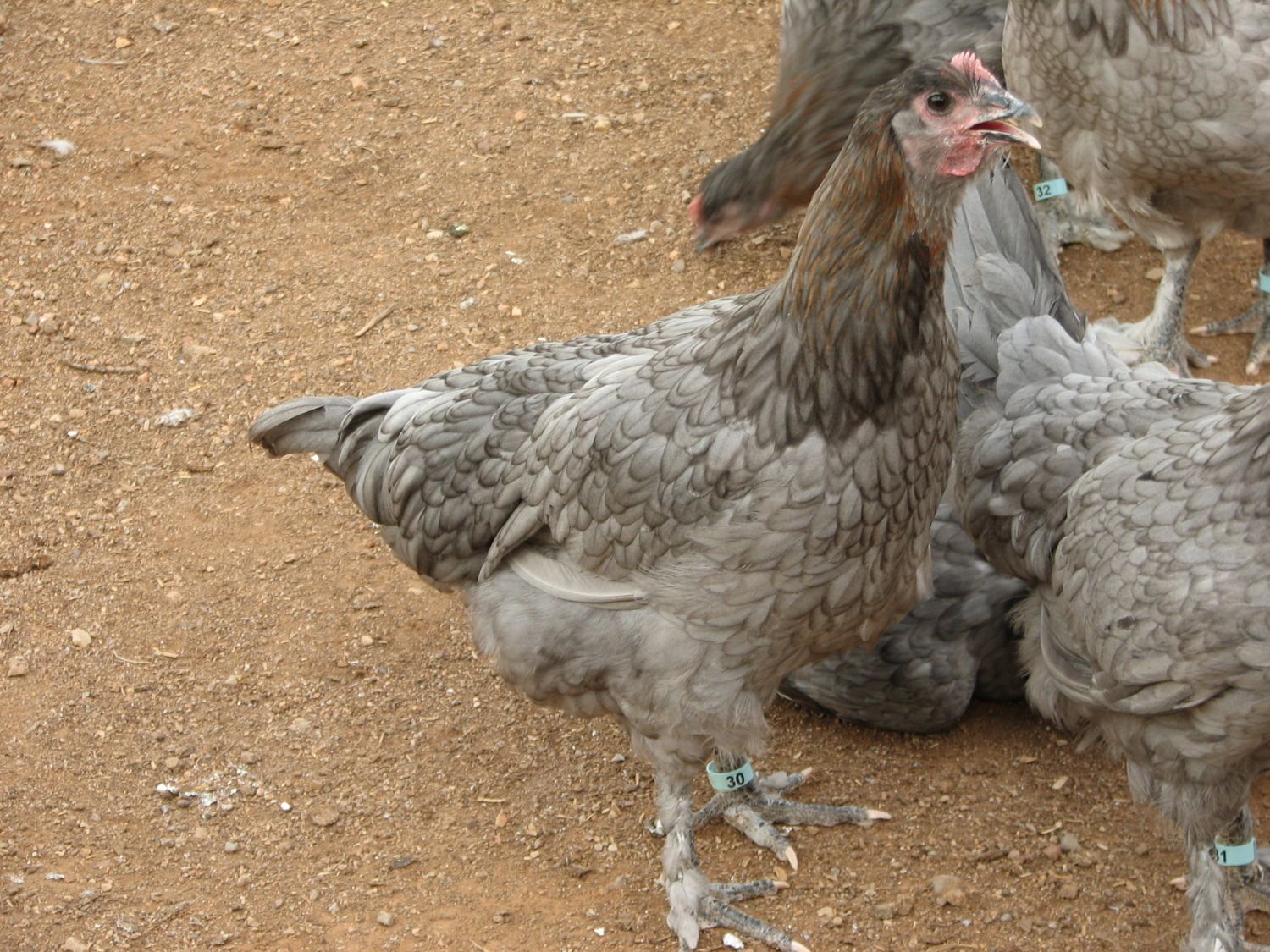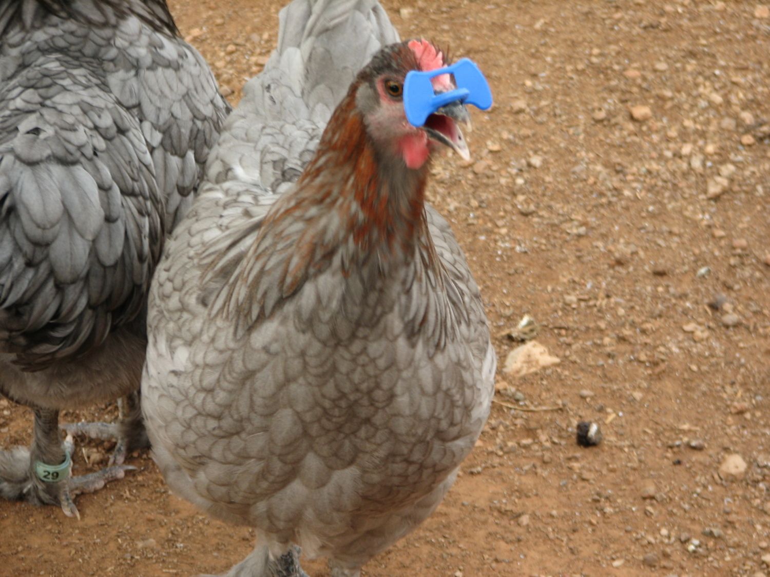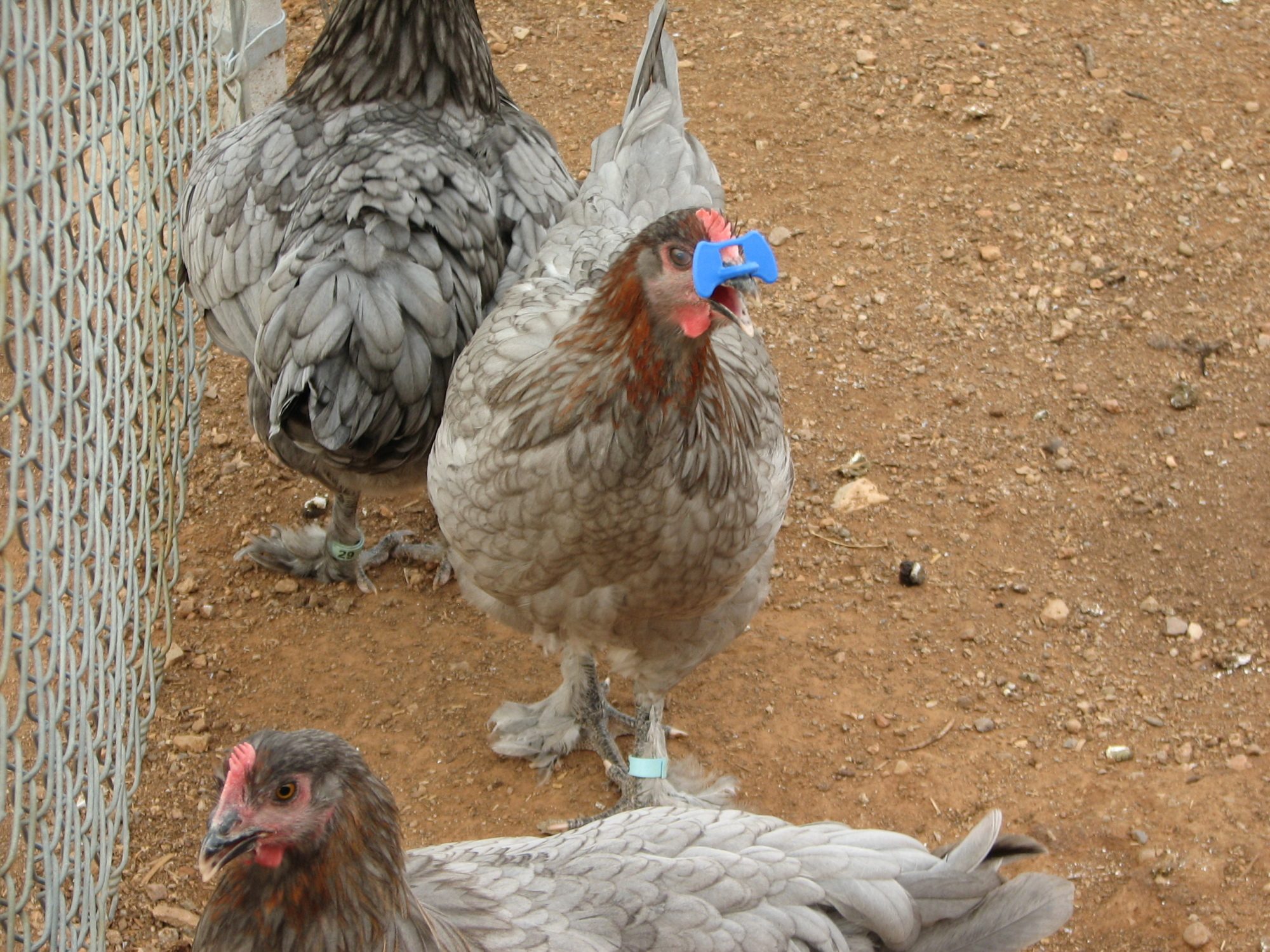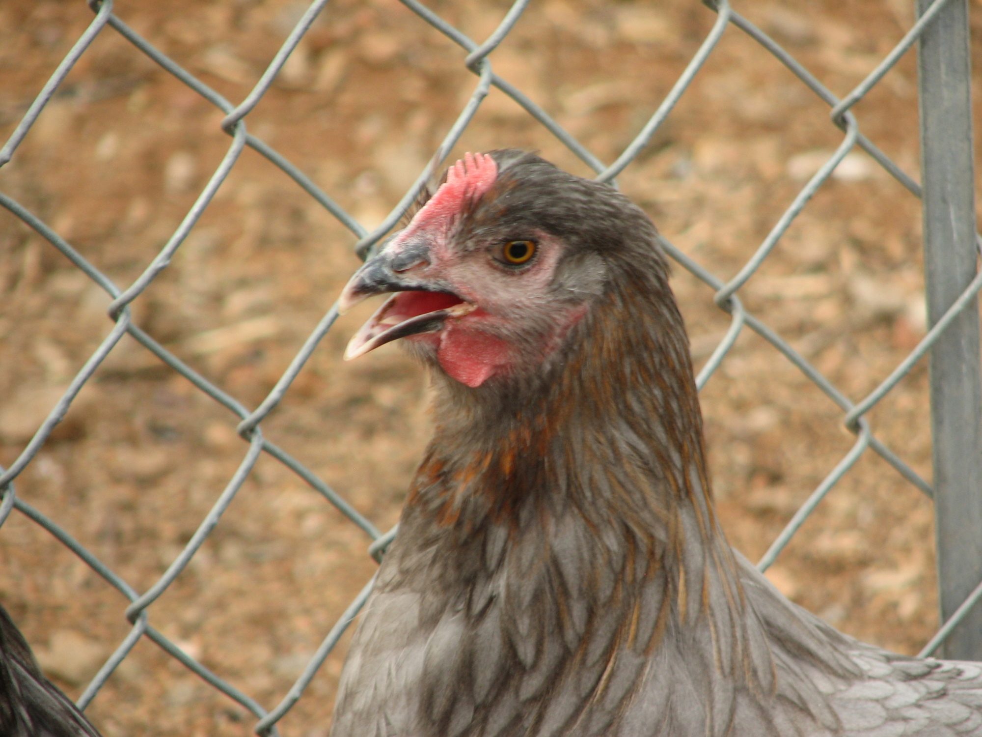 Here are the two Blue Copper pullets I have that have the most copper hackles. Still not enough, IMO, and both are too light in color with poor lacing. But both have the correct eye color. I went through all 7 of my Blue Copper pullets a couple of days ago and made undated notes and checked for sprigs again (none found