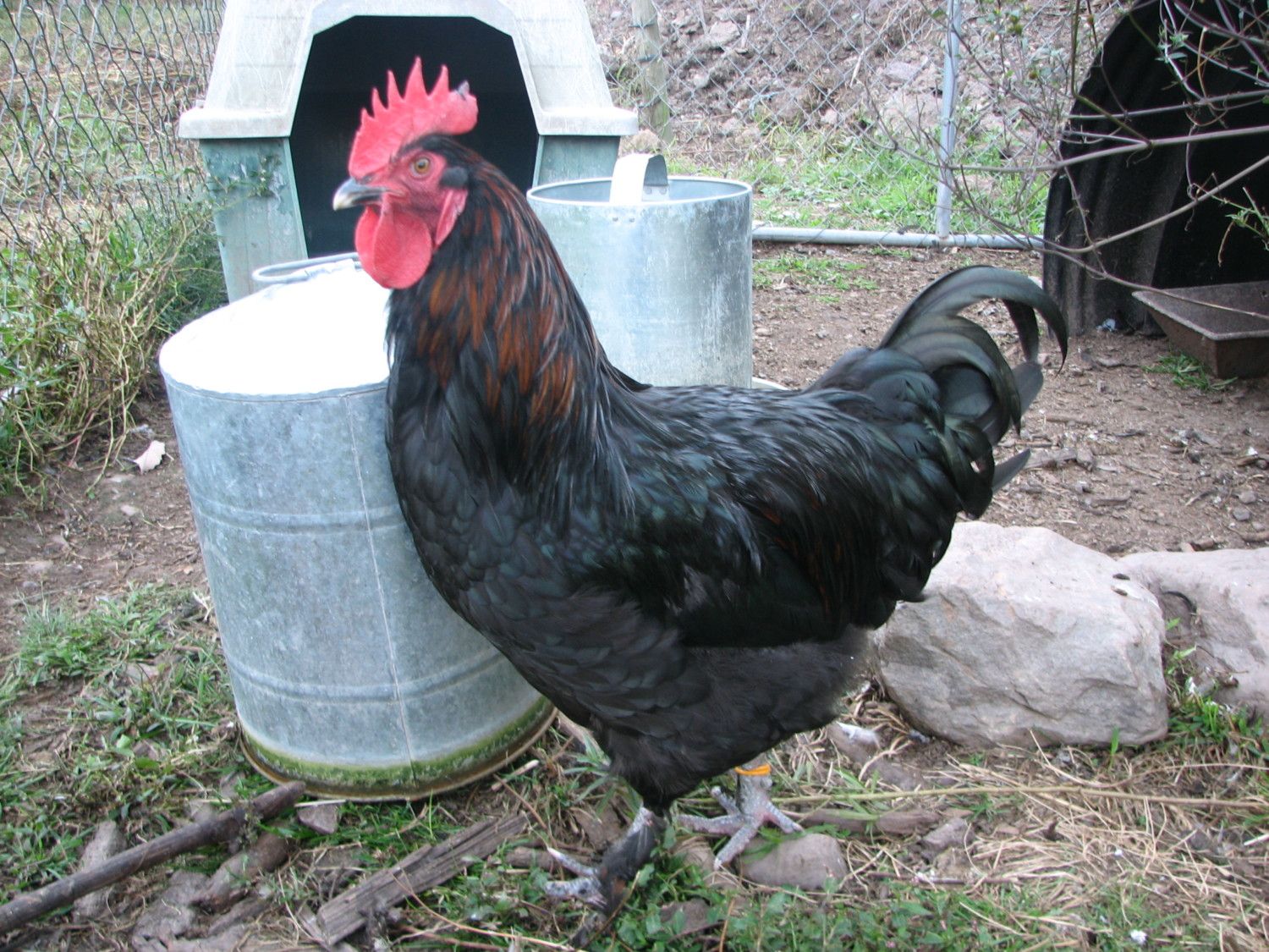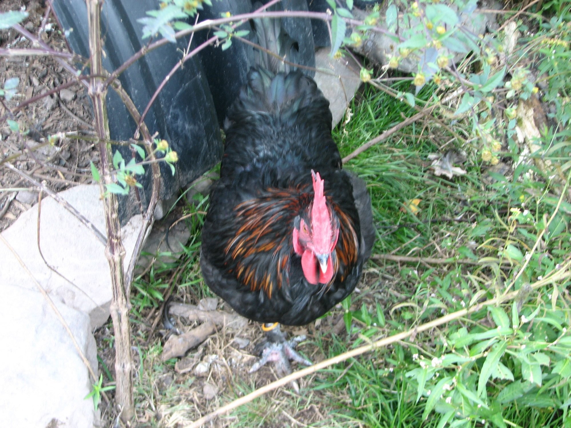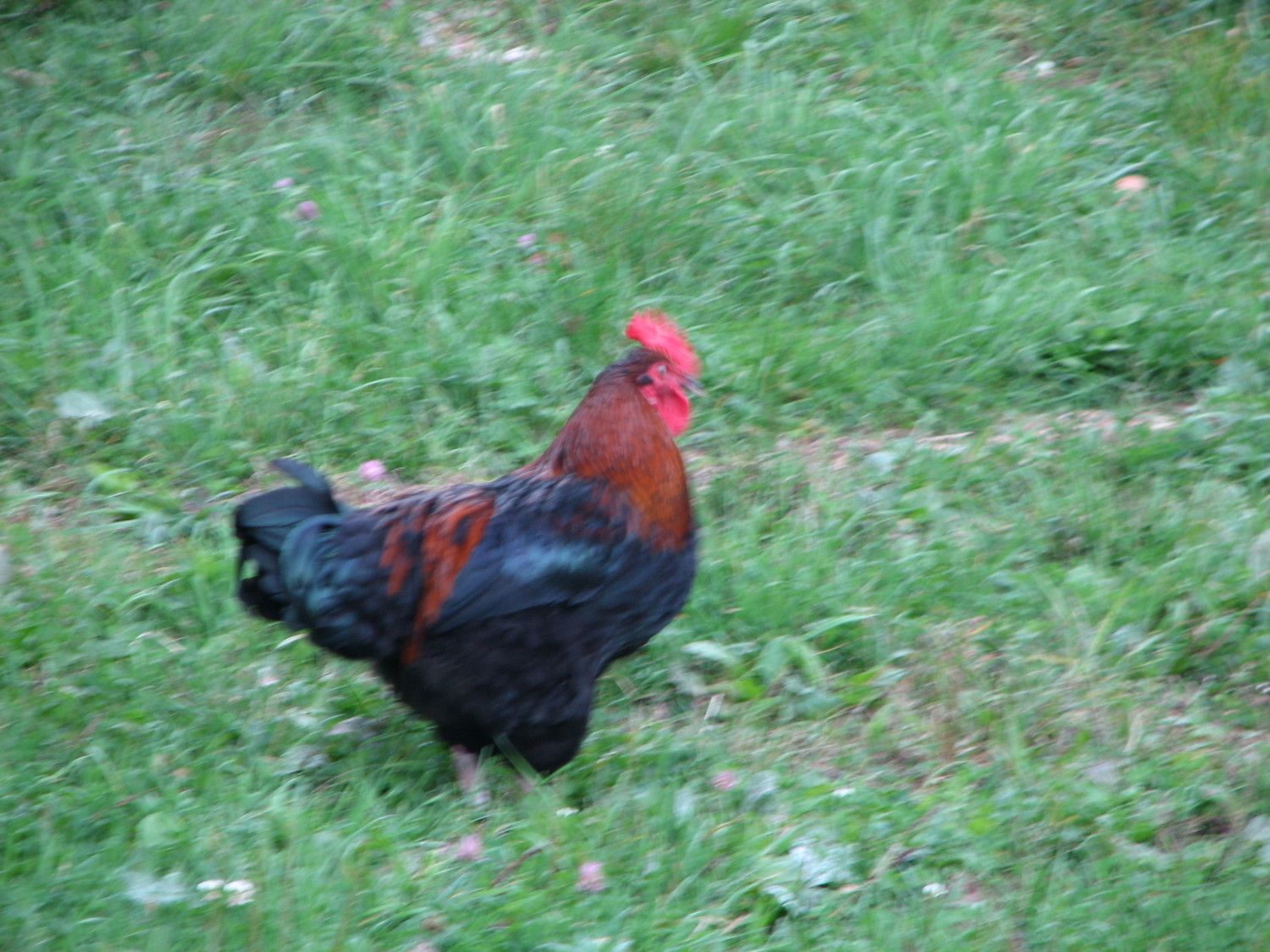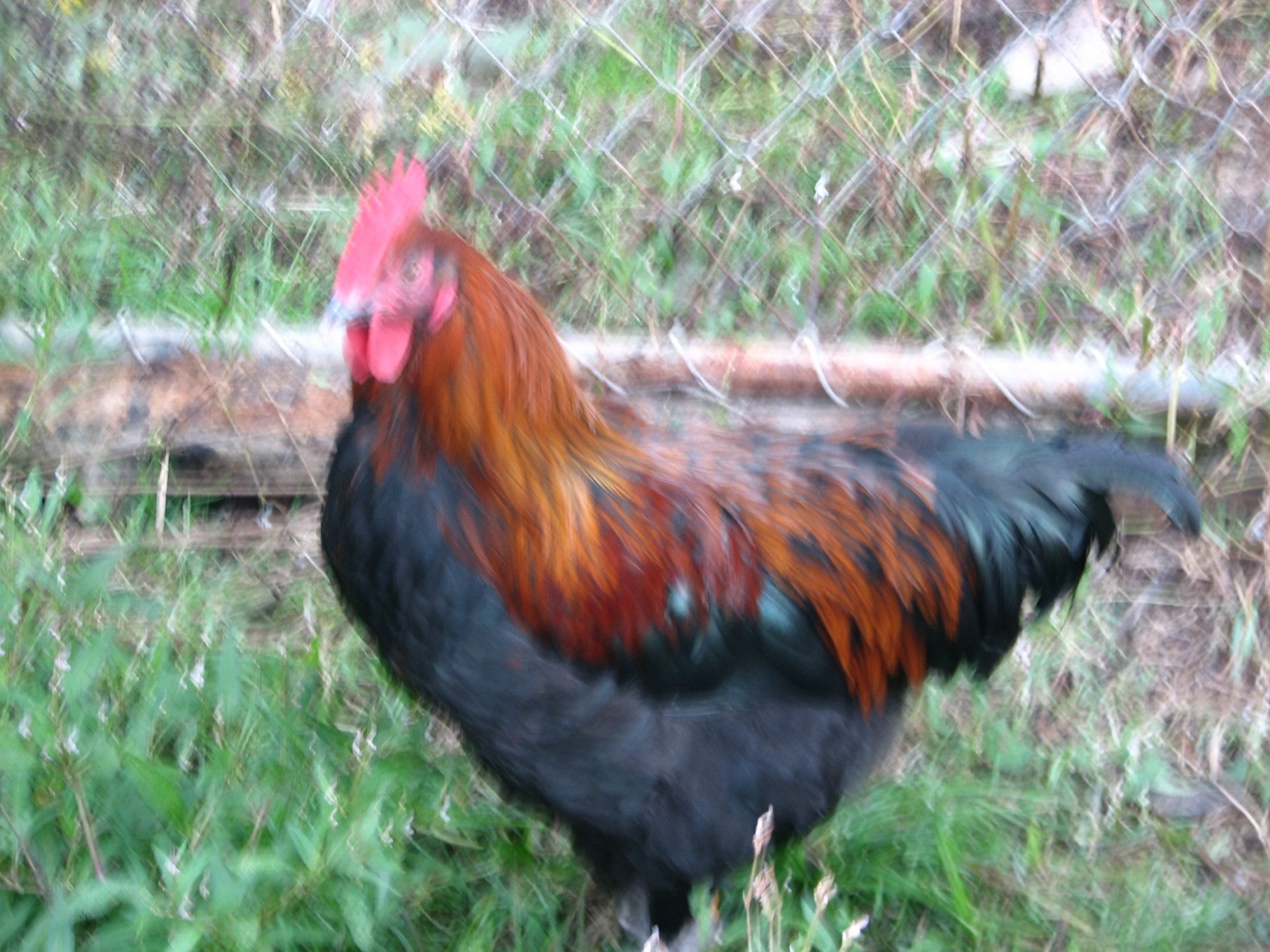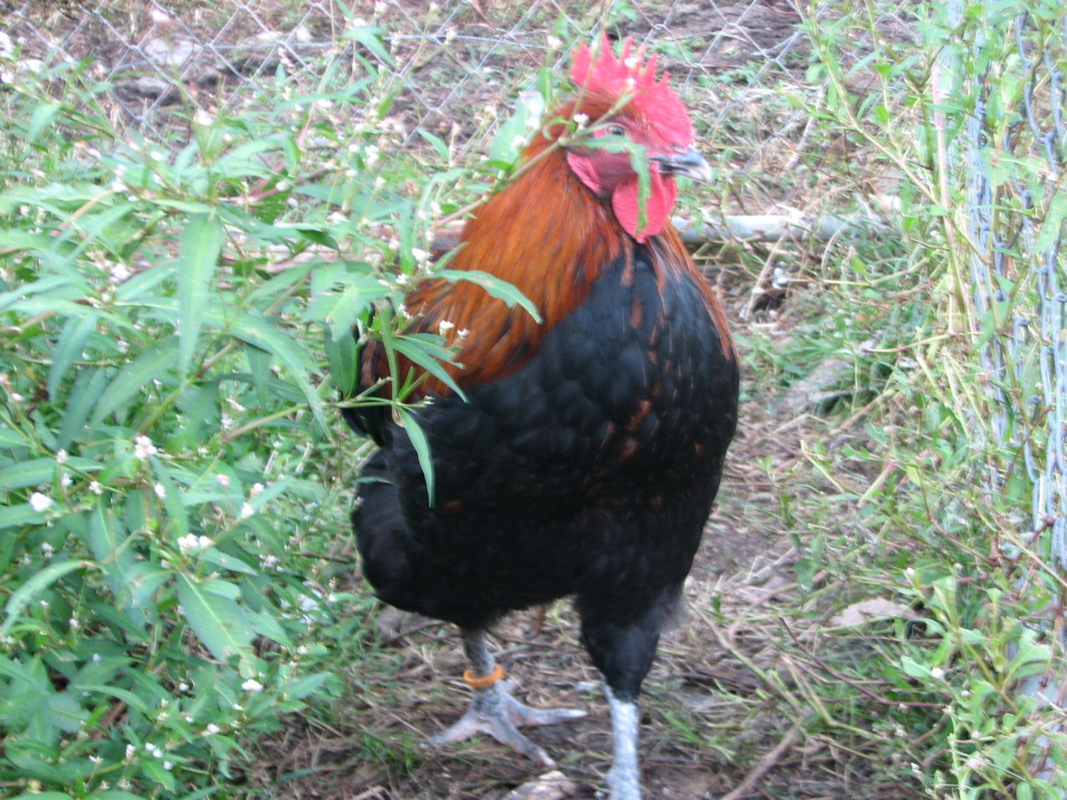 Photos are difficult to get on Red Boy....he's a real mover and is adept at avoiding both pictures and capture. I think I posted this before, but here is Red Boy in natural (moving away LOL) pose. His legs were better feathered earlier on. He's either losing them in the brush (they free range through lots of brambles), molting them, or just plain losing them for some unknown reason.