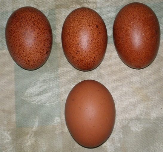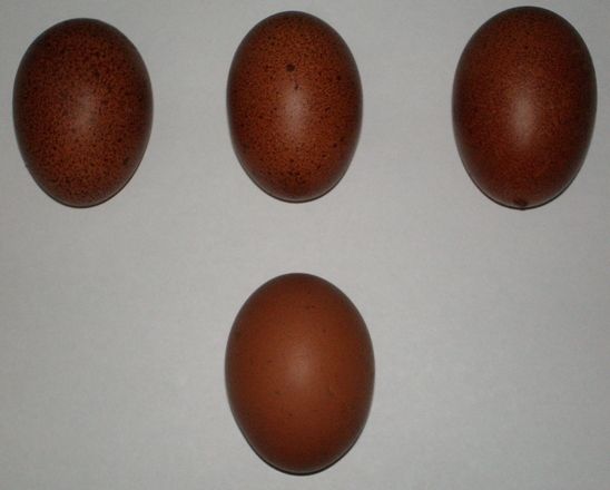 These eggs are a progression from a young BCM pullet of my breeding. She lays super speckled eggs. The bottom egg is todays, lighter looking as it is covered with bloom. What are the thoughts on the speckled eggs?? Her mom and none of her sisters that are laying so far are laying speckles. The other reason I wanted to post these pics. is to show how different the colour shades of the same eggs look with a different background. Of course, this happens with the pics. of birds we all post as well. Any ideas on the best type of light/background to show true colours?? I would say the true colours of these eggs is inbetween the colour of both pics.