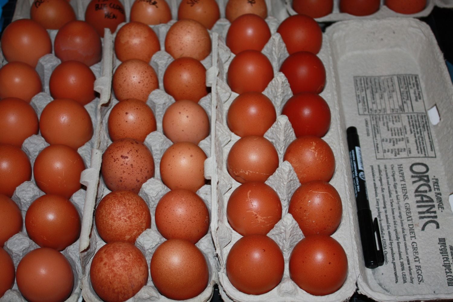 These black birchen babies came home with me today from the sale. Sorry about the wash out on the eggs. I couldn't find a happy medium between the overhead light and flash, but think they are not half bad eggs for birchens! Some of them are very round as well. These are from the same guy I bought those black birchen pullets you liked so well Don. He said he was collecting eggs from all of his birchens, including hens out of cycle, so am willing to cull for body type first, then see what the pullets lay from the hatch. I'll be keeping careful records, but its still exciting to think of the prospects. The darkest ones match up with the 6 on the egg chart, so am willing to work with these eggs, never know what might happen