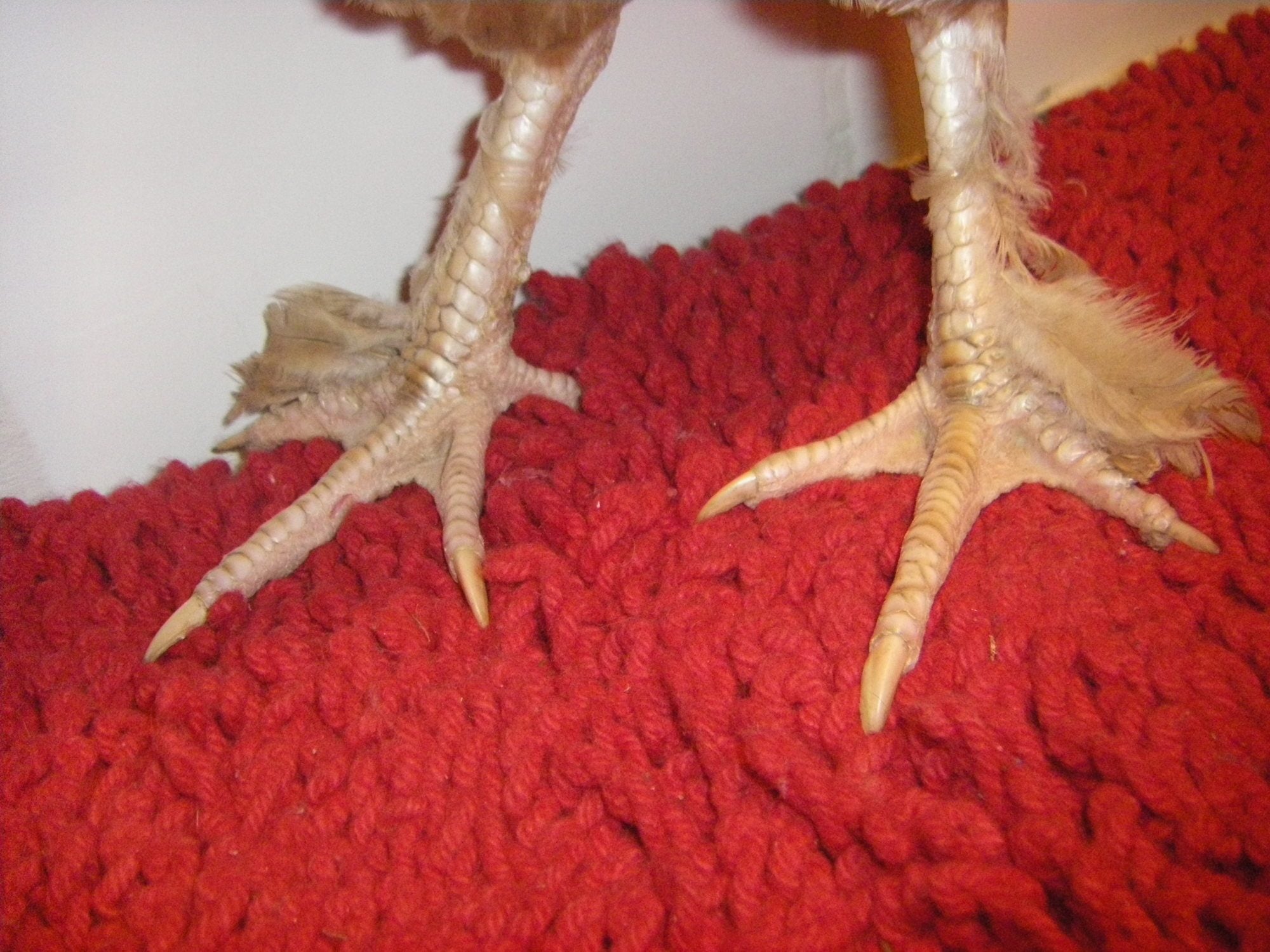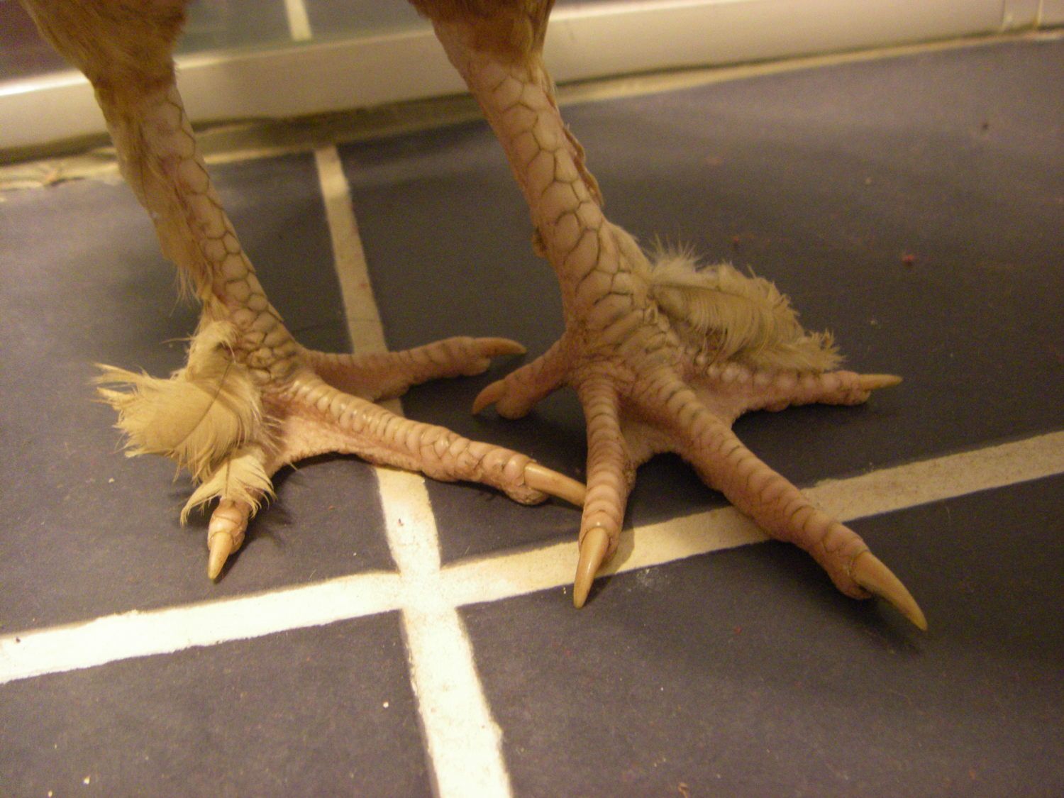 A's feet. Not sure how good the feather cover is but I know French Marans are only supposed to have light feathering.
