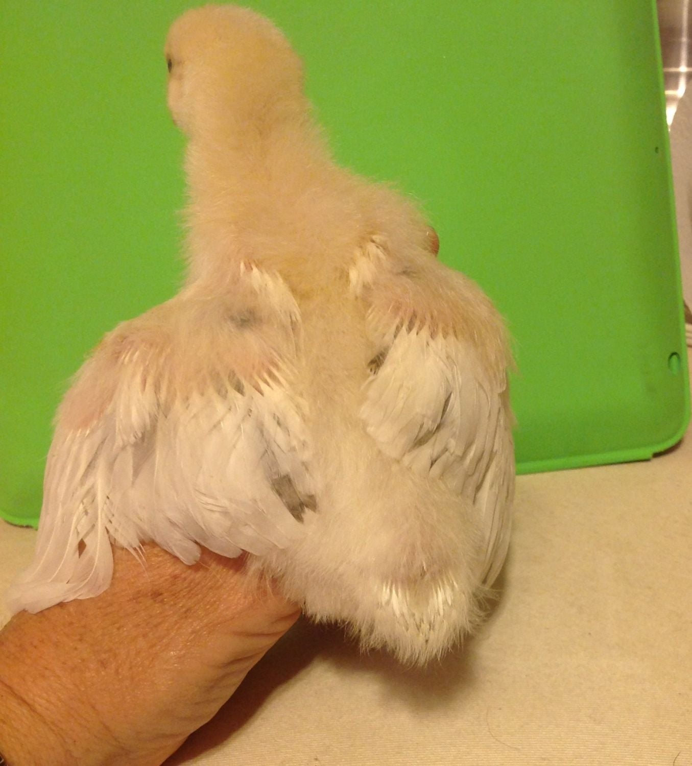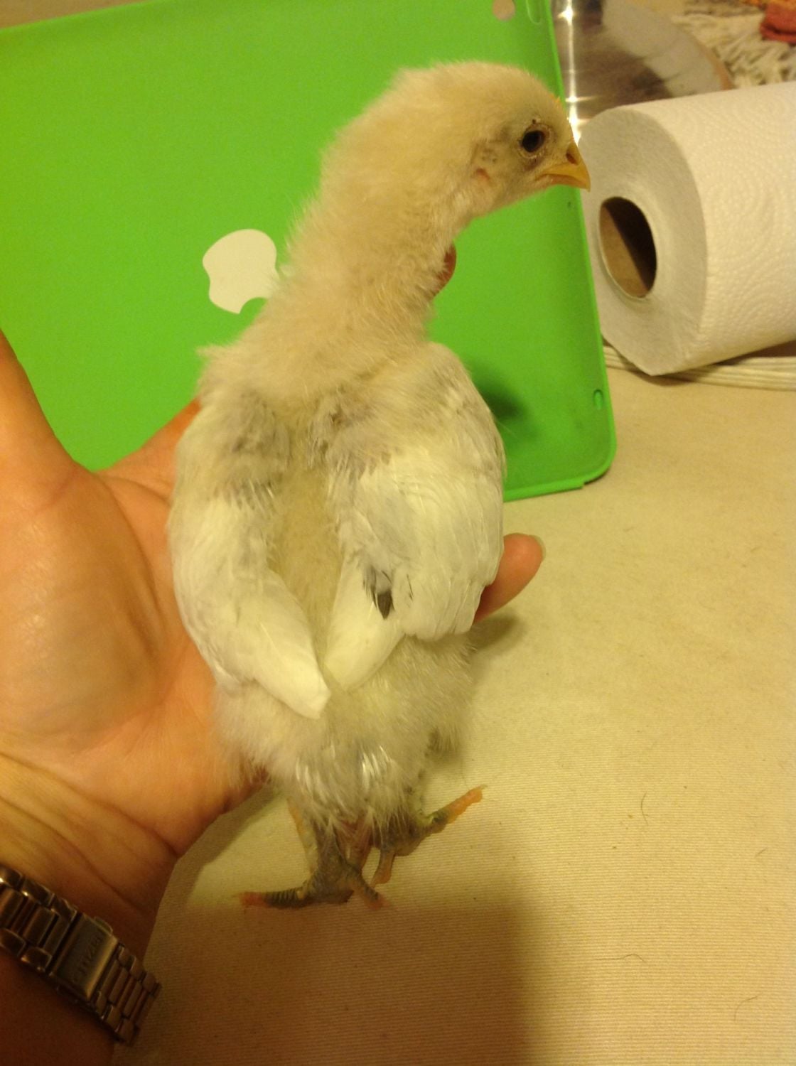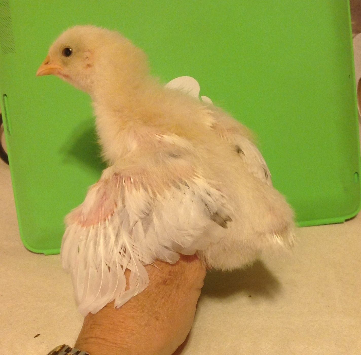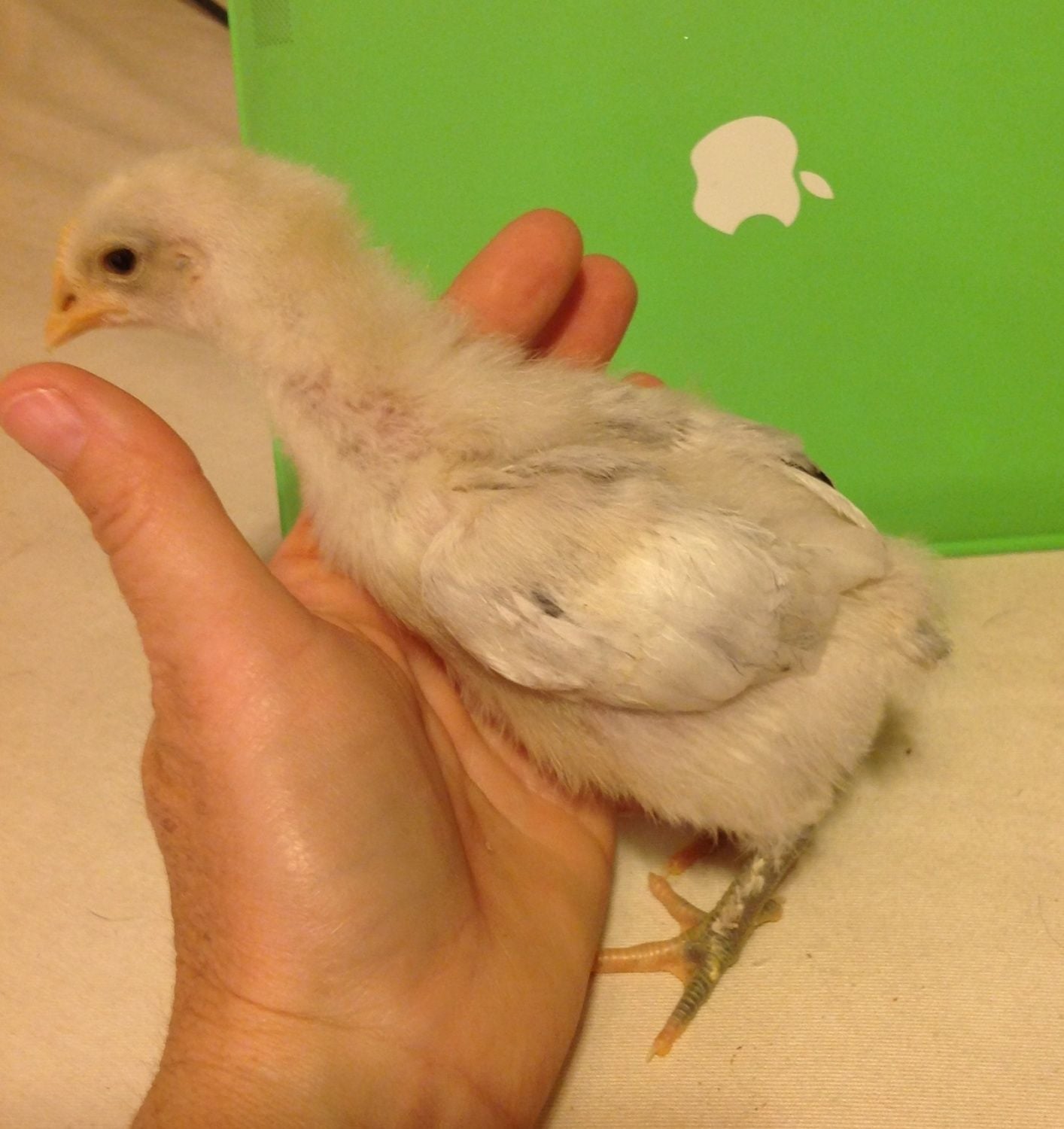 She/He has 1/2 webbed (or at least I think that is what it is called) feet. And her legs and beak are white/pink, not yellow like Leroys. She/He also has long back tail feathers like our other pullets her age where as Leroy has hardly any.