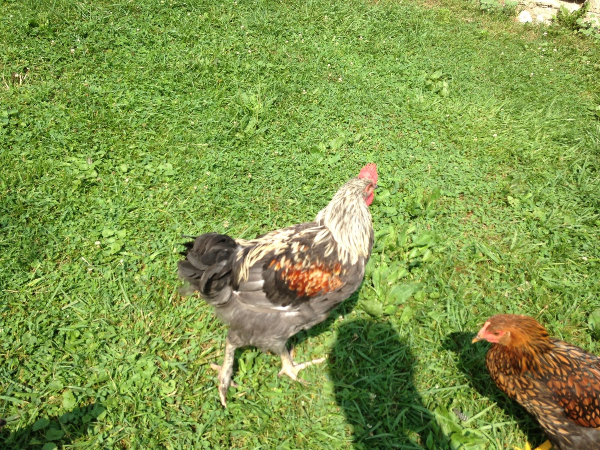 Roo #1 is the better roo in my opinion. He has a nice back and tail set and looks proportionate in all the right places. His leg coloring could be a bit darker, but you can work on that in later offspring. Roo#2, IMO, from what I can see on my monitor, he has too much color or brownish coloring on his lower body and it should be black. Also, he has shafting on the breast, which is not wanted in Marans for breeding quality birds or show birds. Shafting will breed forward and is IMO, indicative of Wheaten genetics in the birds parental lineage.Hello!I was wondering if I could please have my young cockerels critiqued? I have two I kept from a very large batch and as I am still relatively new to breed standards of perfection, could someone more experienced please take a look and point out their flaws for me? It will help me improve my flock and help me learn! I would also like to know if these two are worth keeping and breeding. I am hoping I did alright in selecting them as the best of the bunch. These cockerels are about 5 months old now, and both are black copper. Their shank feathering could be thicker, but they do have feathers along the sides of their legs uniformly. I've thoroughly checked their wings and tails and they do not have any white feathers in there. They also have no side sprigs on their combs. Boy 2 is heavier and taller than boy 1, but boy 1 is wider in the chest. Boy 1 also appears to be a shade darker than Boy 2. Sorry for the low quality pictures, these guys were very shy of my cameraphone and wouldn't stop moving around.