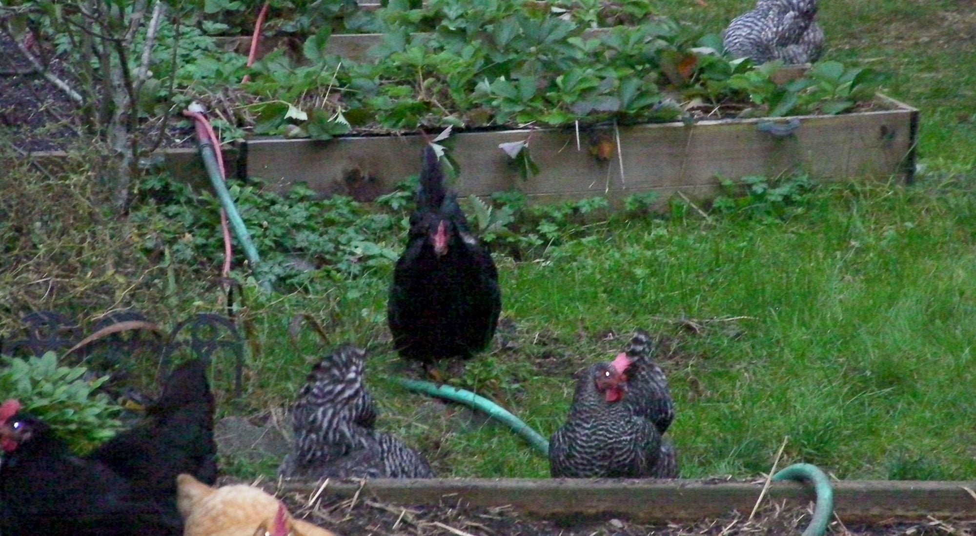 Just a couple of pictures of my Molly Maran. She has started to molt for the second time and she is almost 2 years old now. Molly thinks she is the Mom of the yard. She lays the most beautiful chocolate brown eggs for me. She soon will have another Maran, her name is Cuckoo Channel, (thats right a Cuckoo Maran) they are both very big birds and tower over my other hens.I really love them both. I have to do without eggs from Molly for a bit but Cuckoo will soon start laying, she is laying now I think but I have no way of telling, I have 15 Ladies and only 4 are yet to start laying. The color of the eggs I get are all light tan to chocolate brown. I will know for sure soon the youngest ladies are now 9months old, that is 36 weeks. Cuckoos girlfriends are two Ameraucanas and one Easter Egger. These pictures show the girls out for a garden buffet prior to retiring.