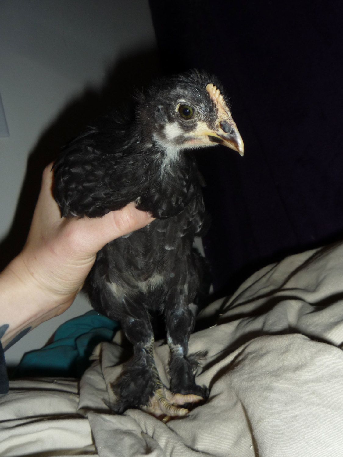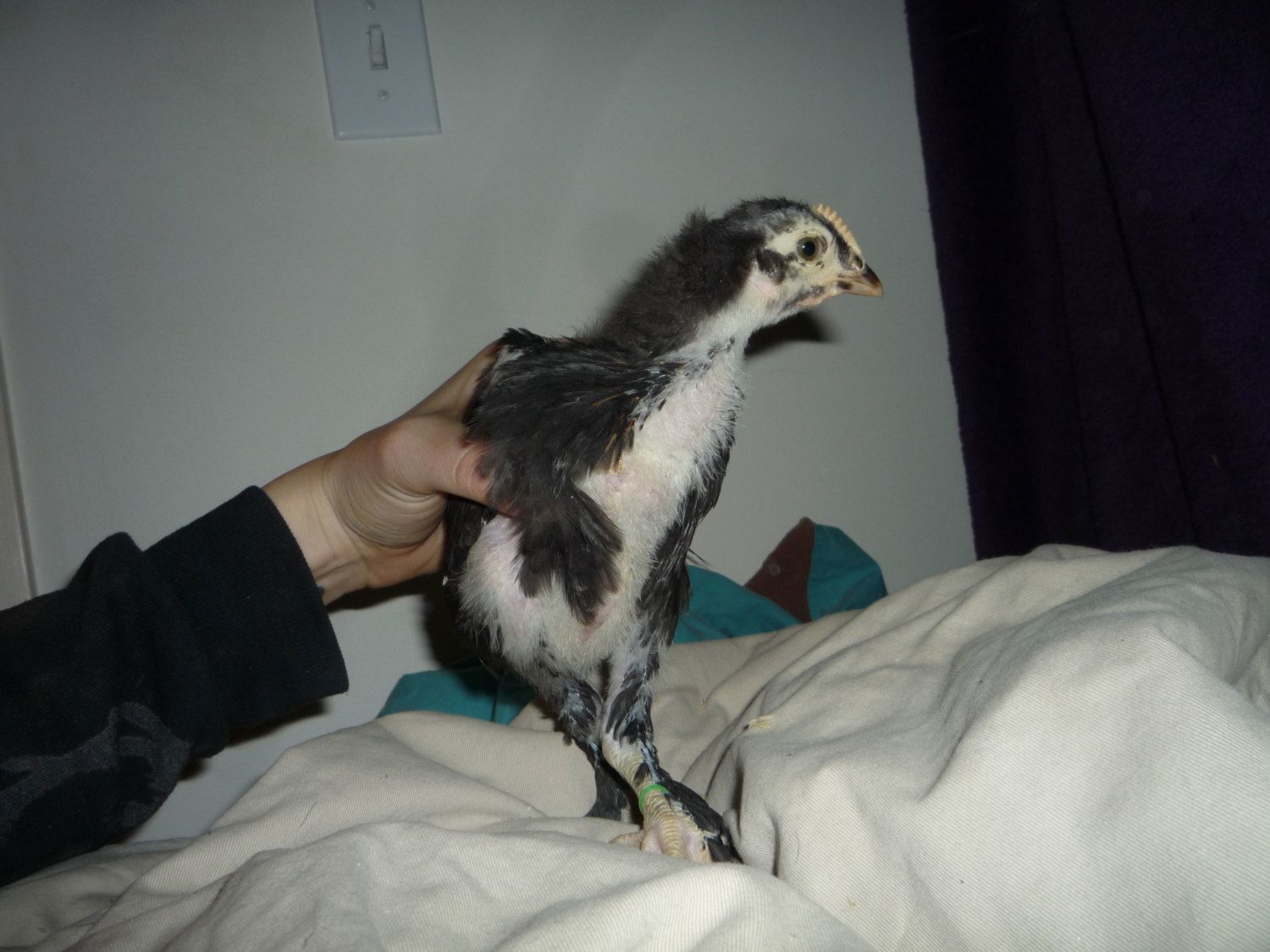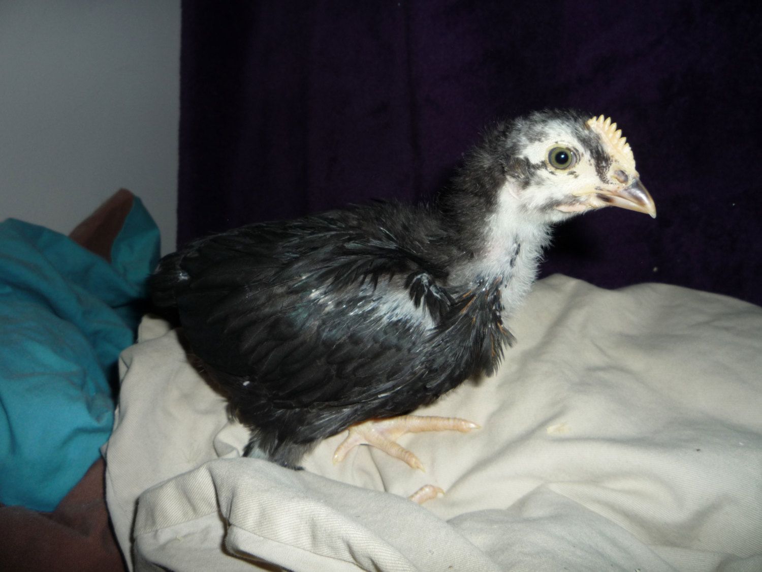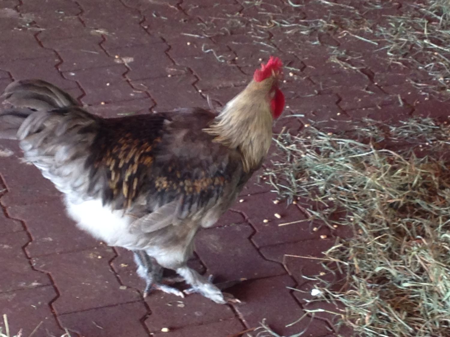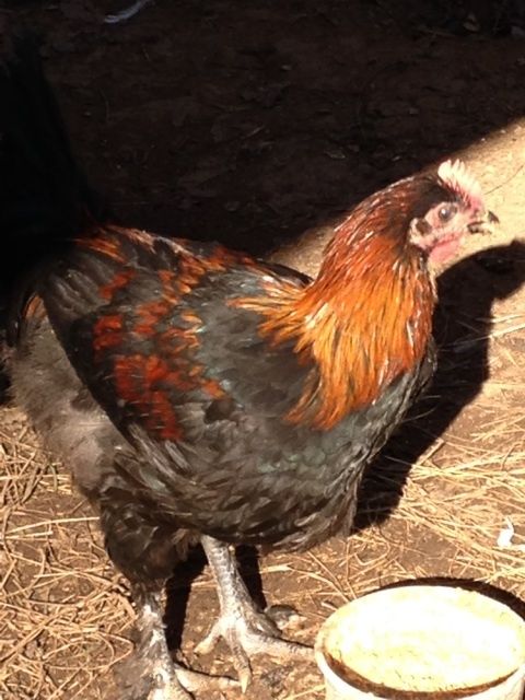 Hi, Deanna - no, he doens't have too much COPPER - so far, he looks to have the perfect amount. His hsanks could have a bit heavier feathering, but that's easily remedied by putting him with females with heavier shank feathering. It's difficult to tell in these pictures, but in the one of him standing, it appears that his eyes may be too dark; you want them to be the color of a pumpkin - orange (referred to as "bay" in the SOP). I can't tell what his back looks like, or if he has the appropriate angle to it, and we really can't see his underline, either to be able to provide feedback on those things. However, from the second pic, his body appears quite pinched, which is not preferred. It could just be due to him being so young. Do you see how his sides are not parallel? You want the sides to go straight back as far back as possible. Again, this could be due to his age and not being filled out just yet. It also appears that he may be knock-kneed, but again, it's difficult to make a judgment by the pics.