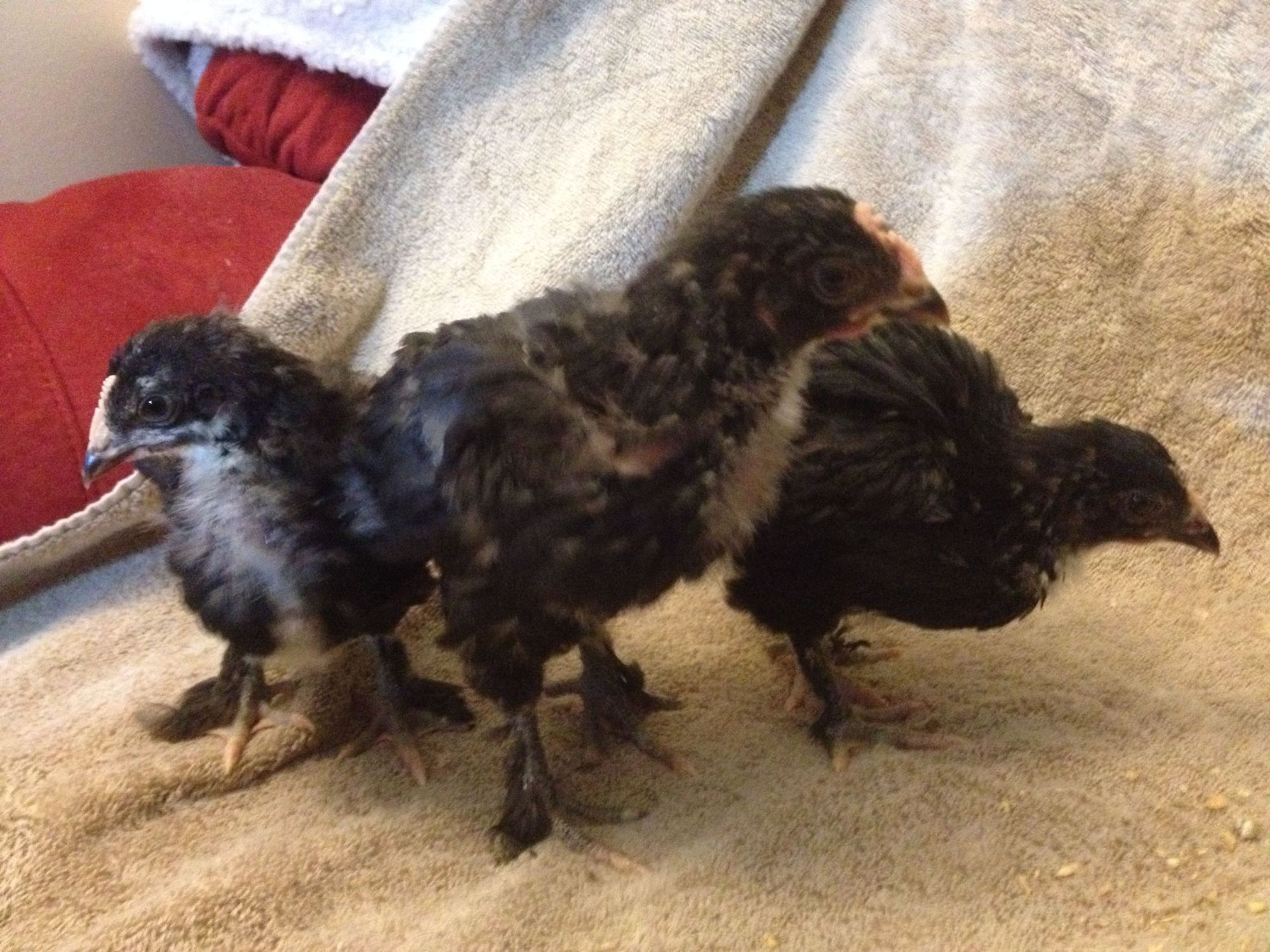 Roo in the middle, pullet on the right, unknown on the left (unknown is the smallest of the three). The roo has a comb that is pinkening and wattles are starting. The other two still have pale combs and no wattles.