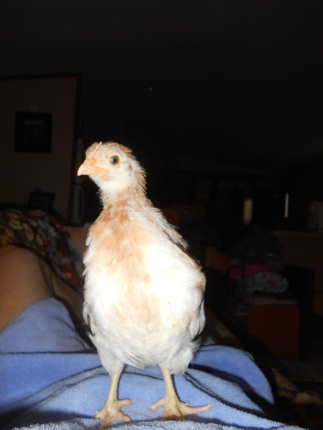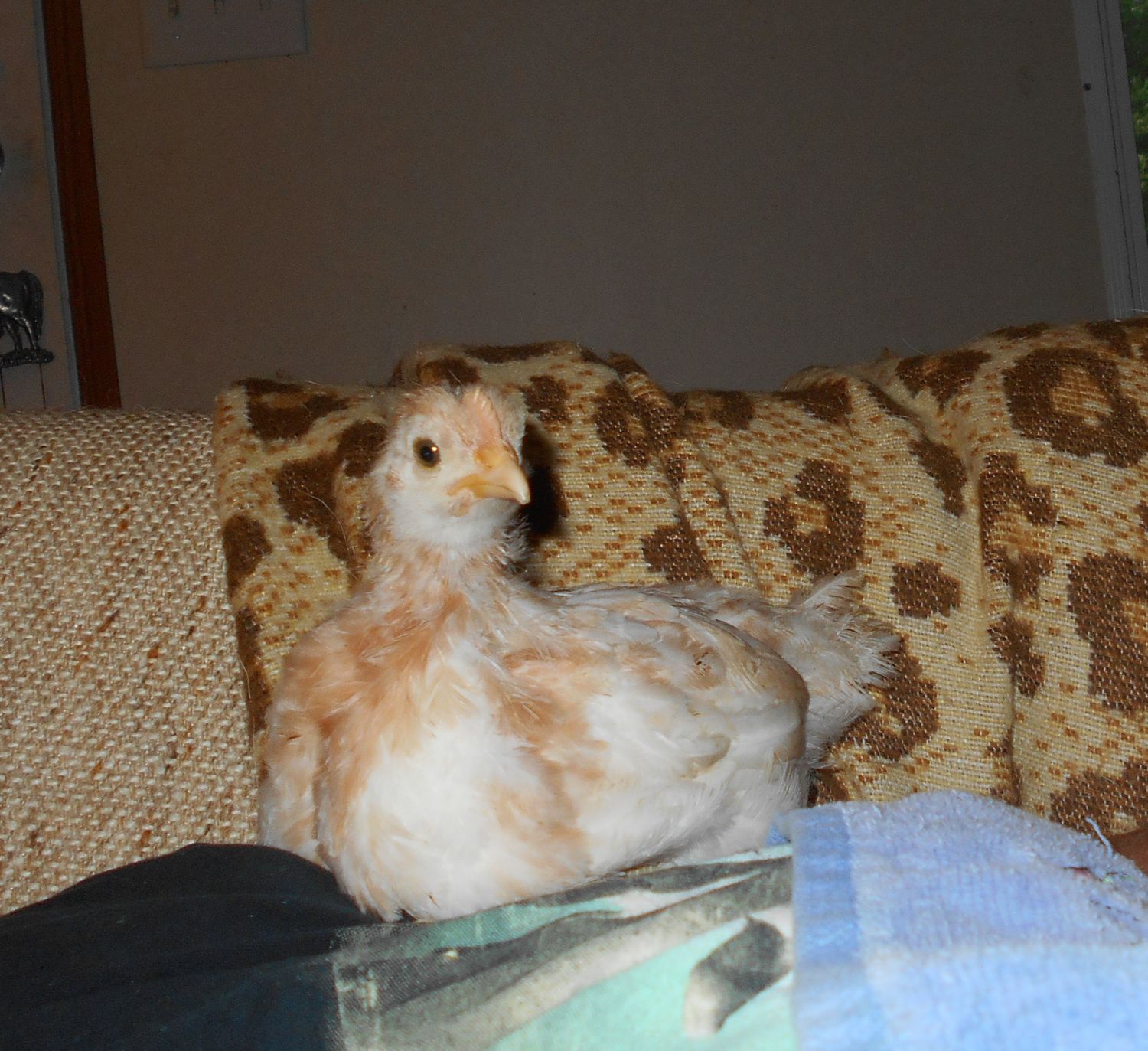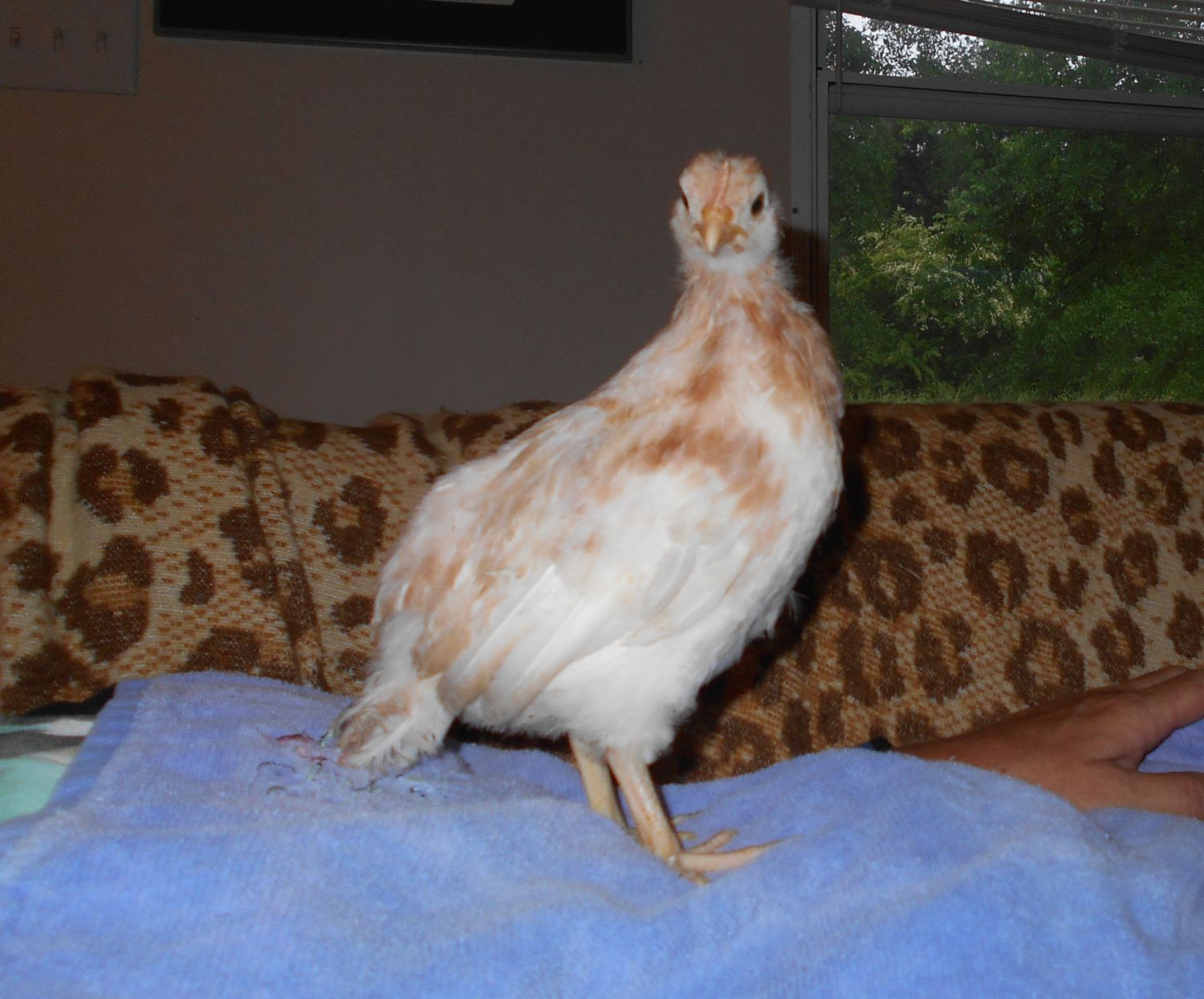Ok, a few pages back, I posted pics of my chipmunk chicks that came out of a (supposedly) pure BCM pen from (supposedly) Davis line chickens. I hatched them out myself from hatching eggs I bought from a local man, so I did see that they hatched out of very dark (I would say 7) eggs. I also got some eggs that were a little bit lighter, out of which I got a little blue roo, whom I also posted a pic of on here. Now that everyone's really pretty much feathered in, I want to post pics of a couple more anomalies. I am REALLY starting to wonder about these chicks! There are an awful lot of (to me) strange things going on, color-wise, in these supposedly purebred Marans! For instance, this little girl, whom I jokingly call a Creamsicle Marans! She's got one toe feather on each foot, and that's it. She is THE SWEETEST baby, but what the heck is she??
