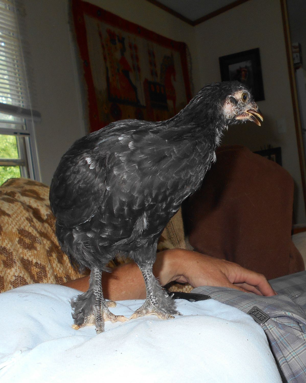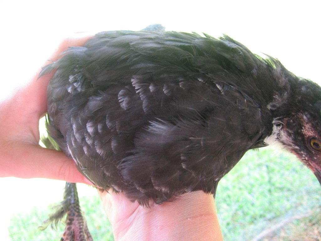 Ok....got some snuggle time in with my little white-tipped feather girl, so here are a couple of pics of her at 6 weeks. She doesn't have nearly as much white as the little cockerel, and it is just on her chest and a little bit down the side towards the front of her wings. She was born nearly solid black with very slight "tuxedo" markings like you would expect of a regular BCM. I don't know if she will keep these white tips after her juvie moult or not, but it is rather odd even if it is pretty. Just wondering where this comes from!
