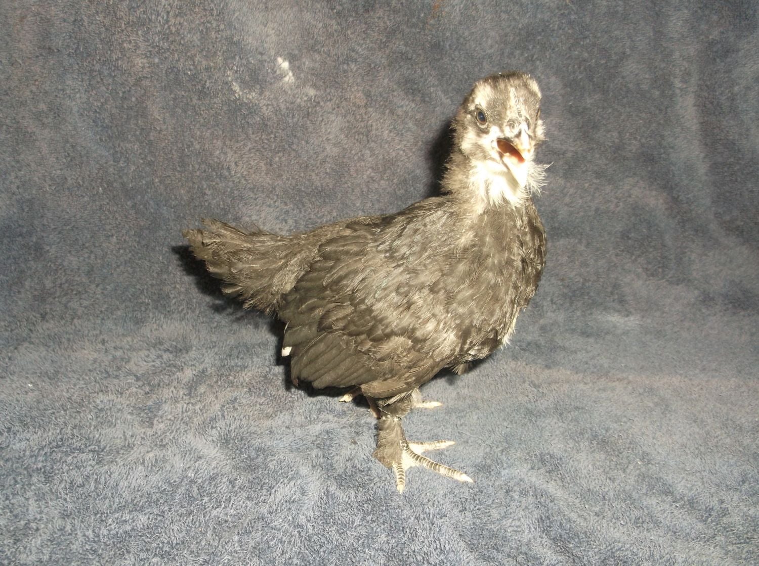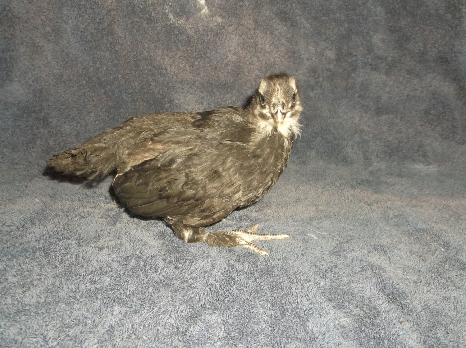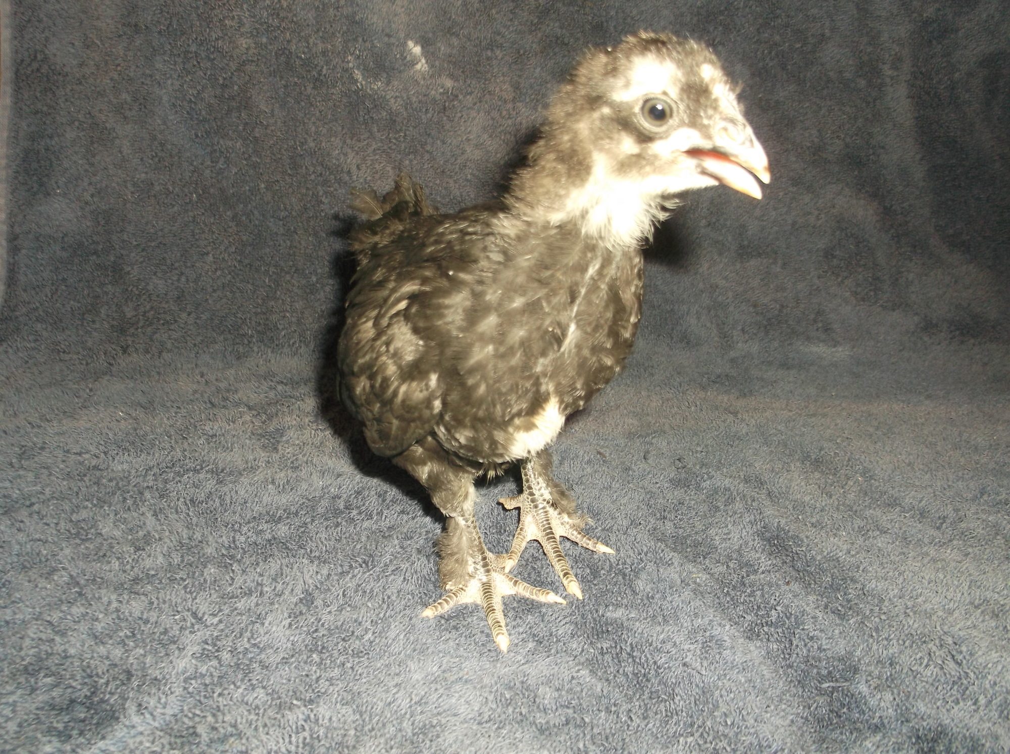 2. I have a lot of variation in color, and I'm wondering if that is normal, and if not, what it means for the adult plumage. One or two chicks seem to have a lot of white around their faces. They all have wing feathers and the beginnings of tail feathers, and almost all of them have two or three white feathers on each wing. A few have no white besides their original chick down. The amount of dark coloration on their legs and feet varies as well. Some are all black, some black with yellow toes, and some with black only halfway down the shank. Some chicks have yellow combs, and some have black combs.