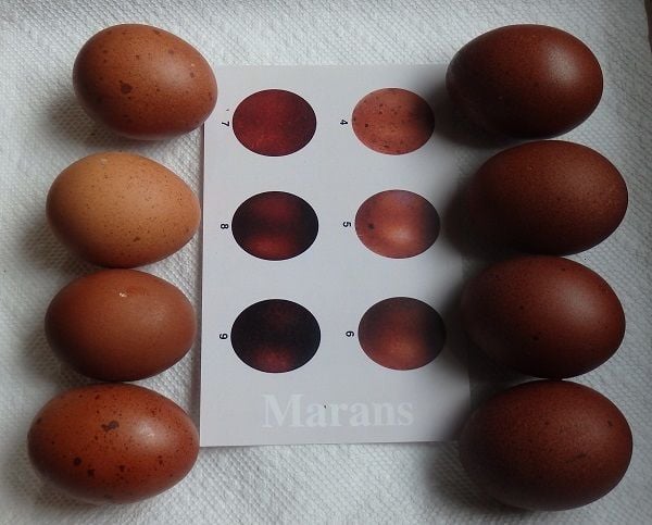 What color are the Marans eggs on the Marans egg color chart? It's impossible to tell with different lighting, monitors, etc. without one. We always have the chart in our egg photos. It's helpful also to punch a hole in each egg color on the chart and put your egg behind the chart for most clear color matching, like this: