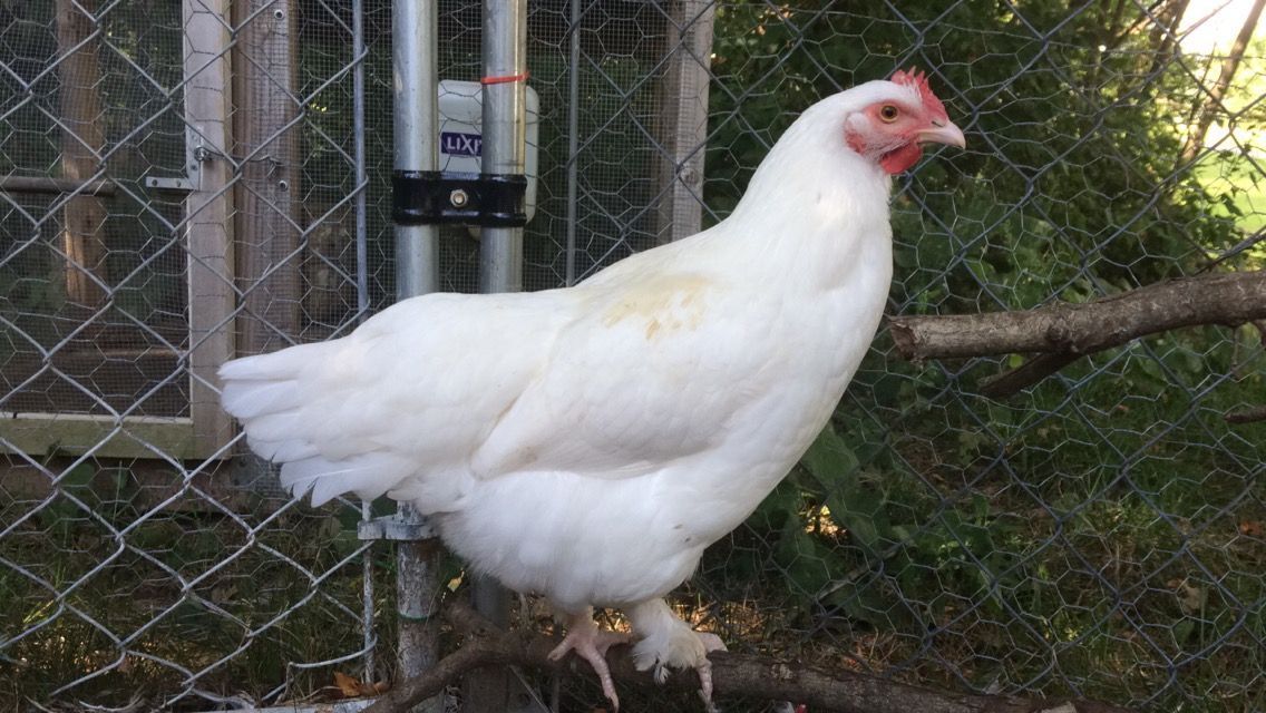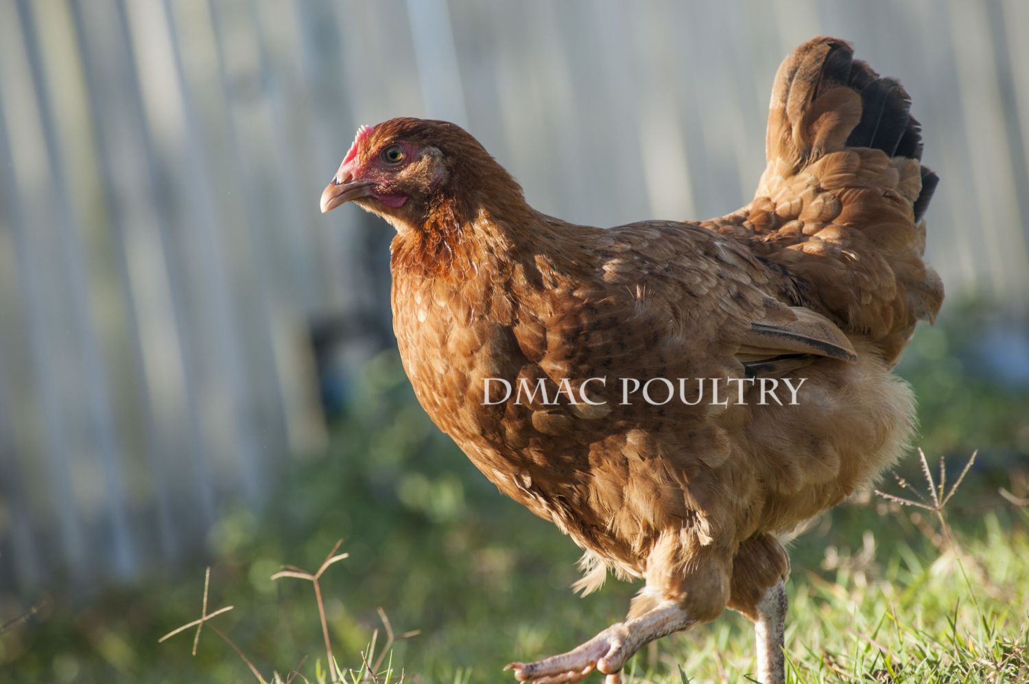 maran x brown leghorn pullet, im hoping for dark eggs but not holding my breath..pretty girl. about 20 weeks