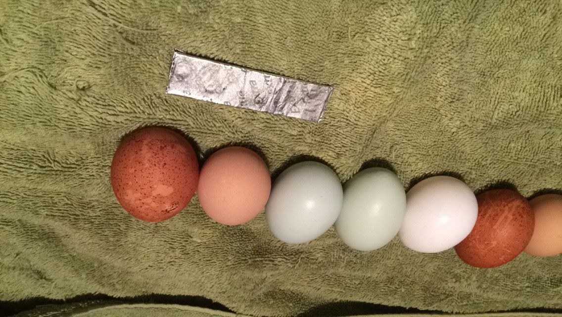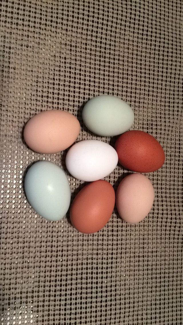 The two darkest are my marans' eggs. The one nearest the top is Elsa's. It's hard to see the beauty in it in a picture.