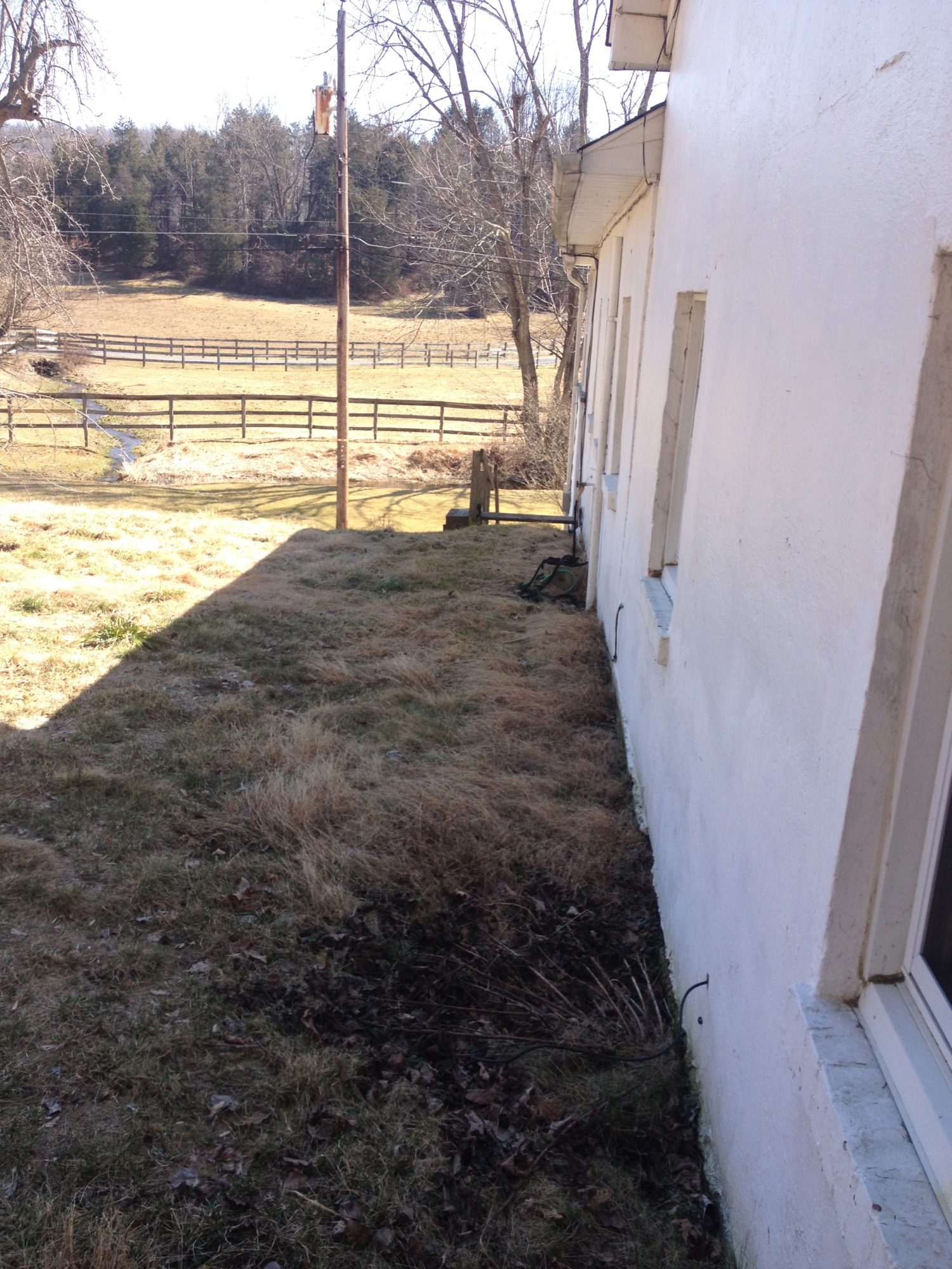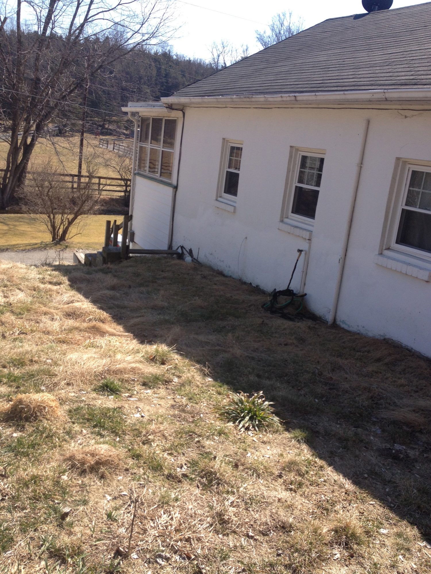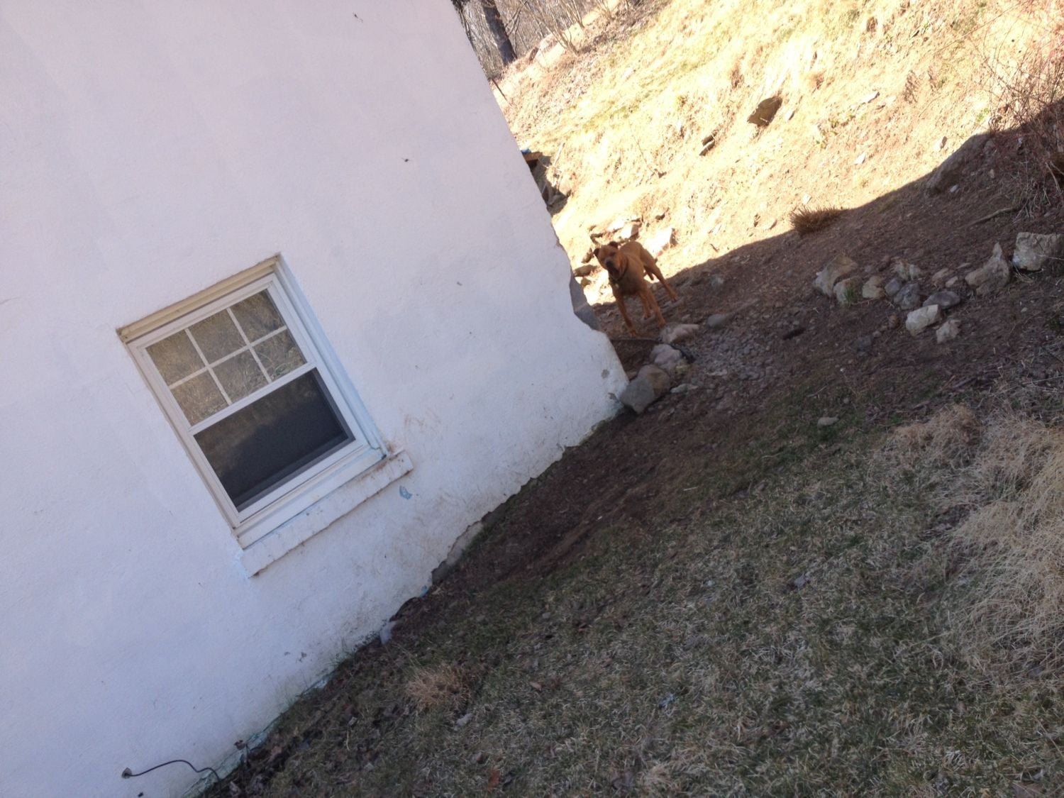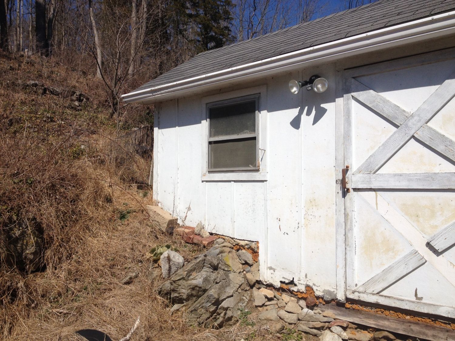 Beroom window, and 'round the corner to the back patio, woodshed, and the hill that is terraced and our property. Not really a back yard, to speak of...