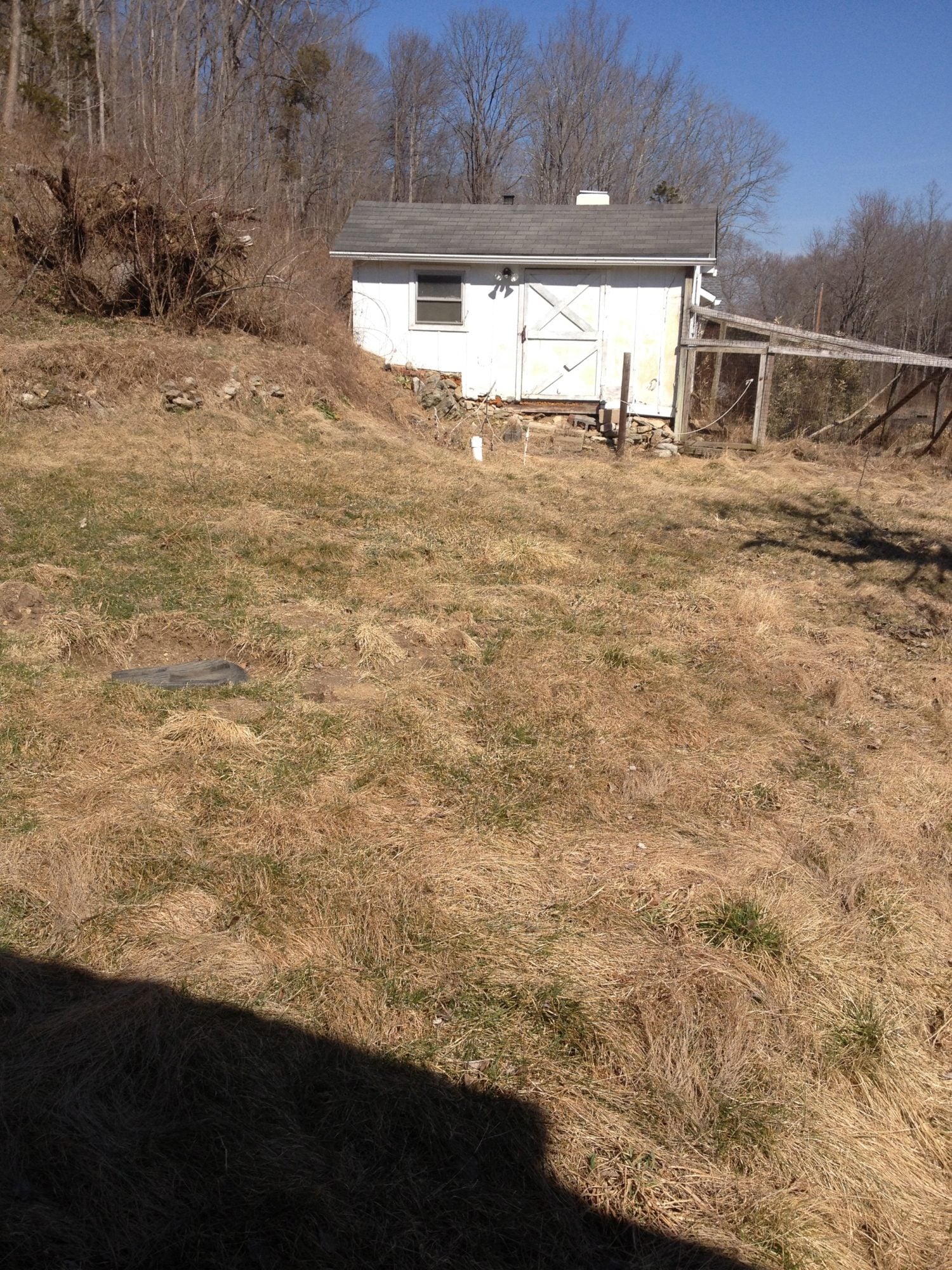 Here are pix looking from the rear corner of the house across the side yard to the coop (and from the same corner out back, up the hill the house was built into).