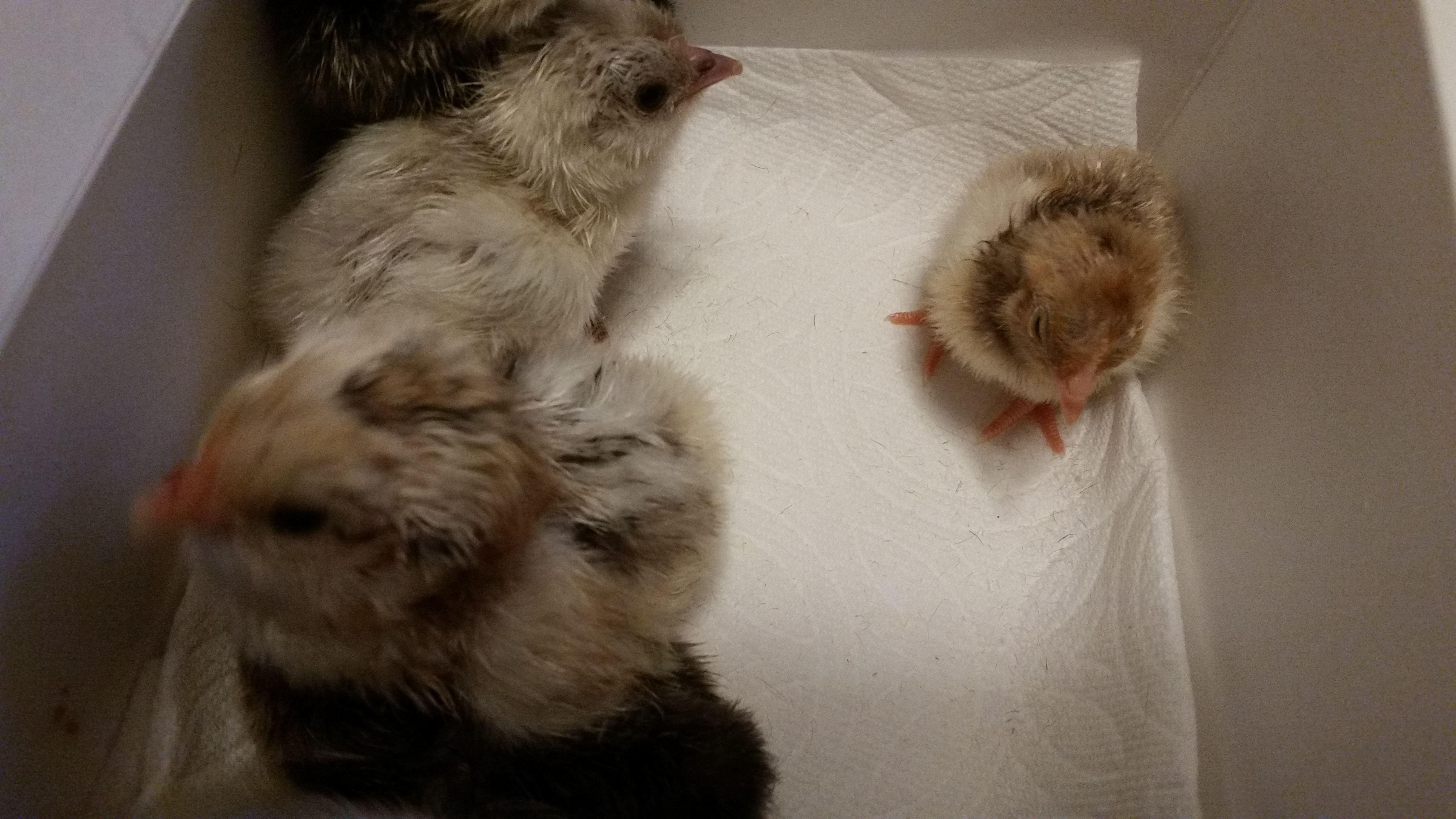 Beautiful babies!I notice that everyone else takes the new baby chicks and places them in a pretty pose and snaps BEAUTIFUL photos. I throw them into a box and snap a quick photo - don't check to see if it's clear, then I put them away. Well, here is a photo of last nights transfer:And this is from this morning....