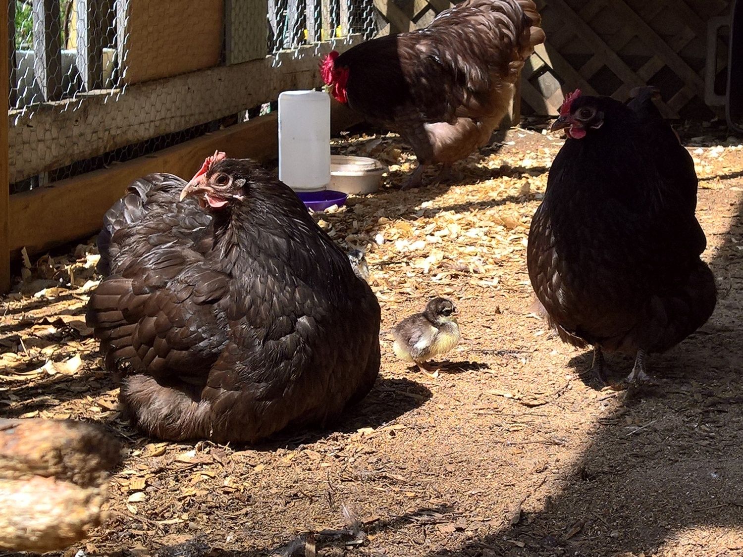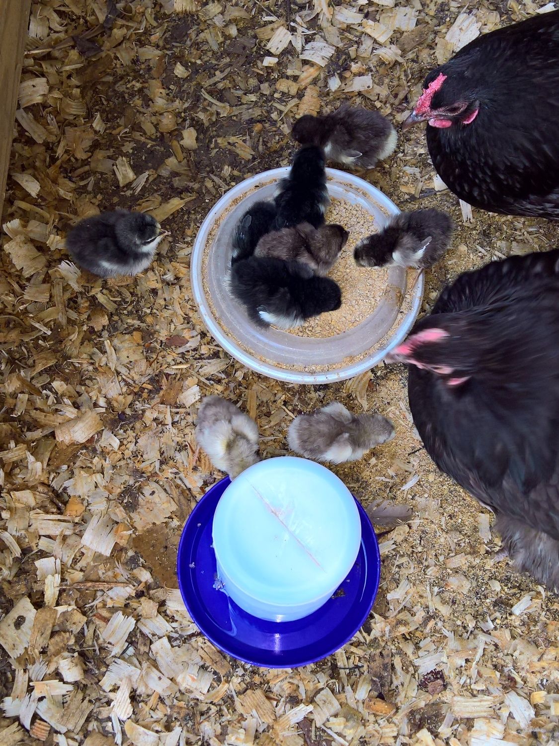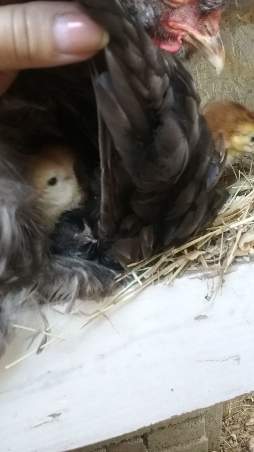 I had an interesting surprise when I went out today. There was an extra black silkie chick running around. I have no idea how I've missed it for the past 5 days when I go out there every day to mess with them. One or the other black silkie chick must've always been under my showgirl instead of out with their mother. I've always just counted 7 chicks and today there were 8. I recounted several times, but I knew I had only seen 3 black chicks, so something was off when there were 4 black chicks. Kinda fun adding a chick instead of losing one. :-D