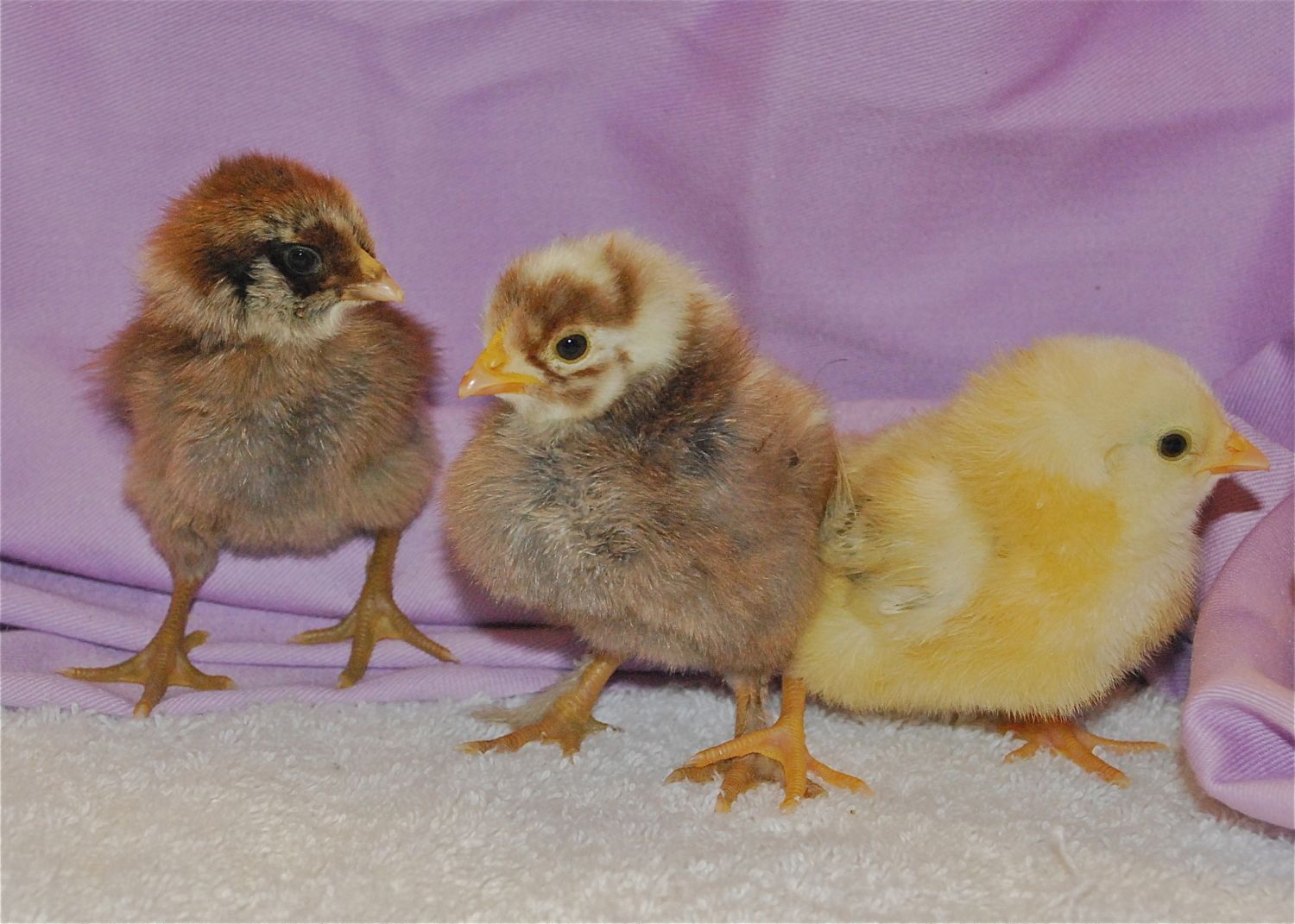 I am now the proud owner of Purple egg laying chickens courtesy of Wolftracks. The two in front are from the purple eggs. Quite sure the one on the right is a roo. Can't wait to see what the brown looks like when she feathers out. Thanks Wolftracks!