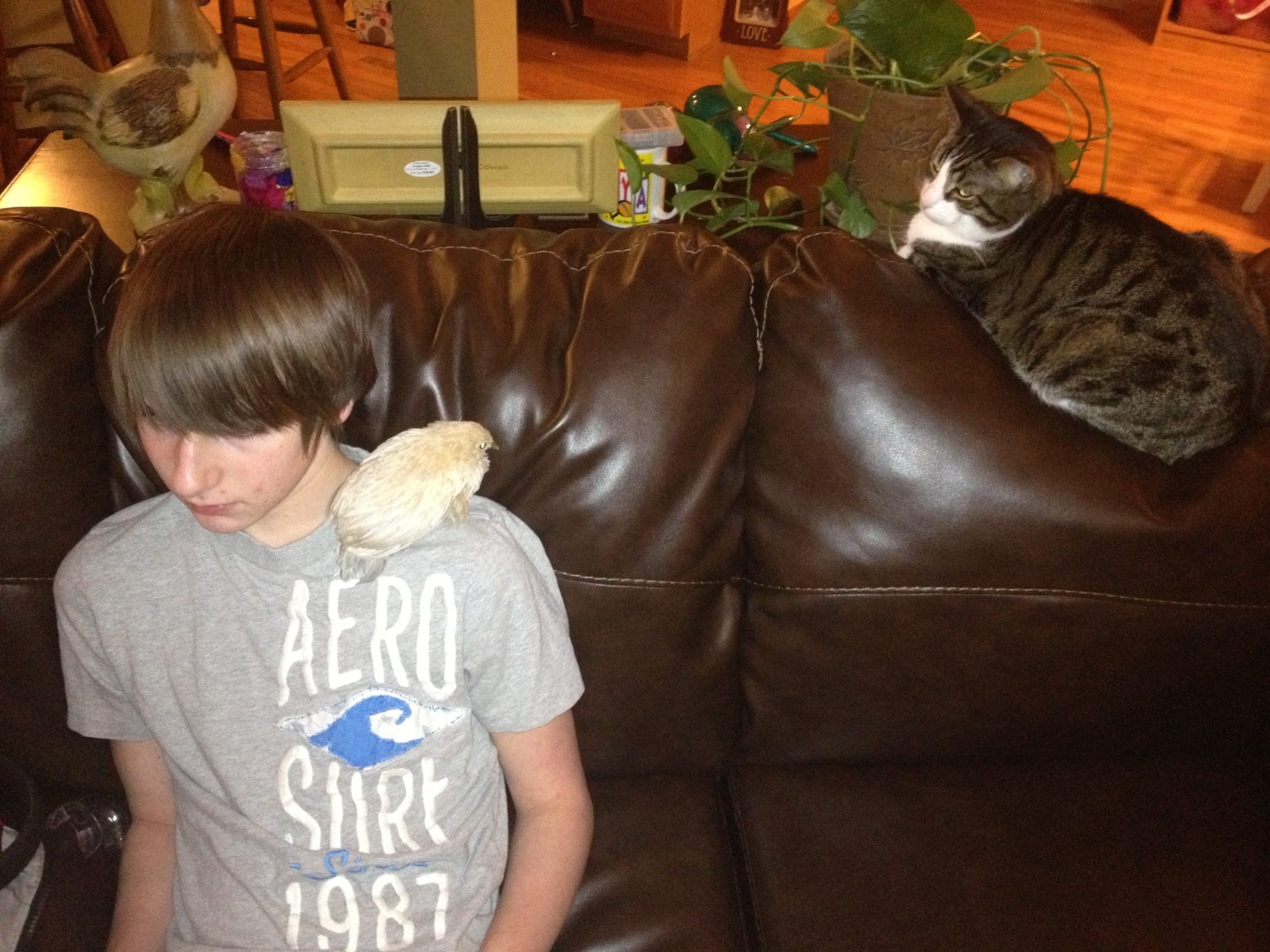 Of course, our cat just LOVES that! Hehe...kidding. Julius loves the chicks and has never messed with them. He is declawed and lazy too. No worries, I keep my ALL my babies safe.