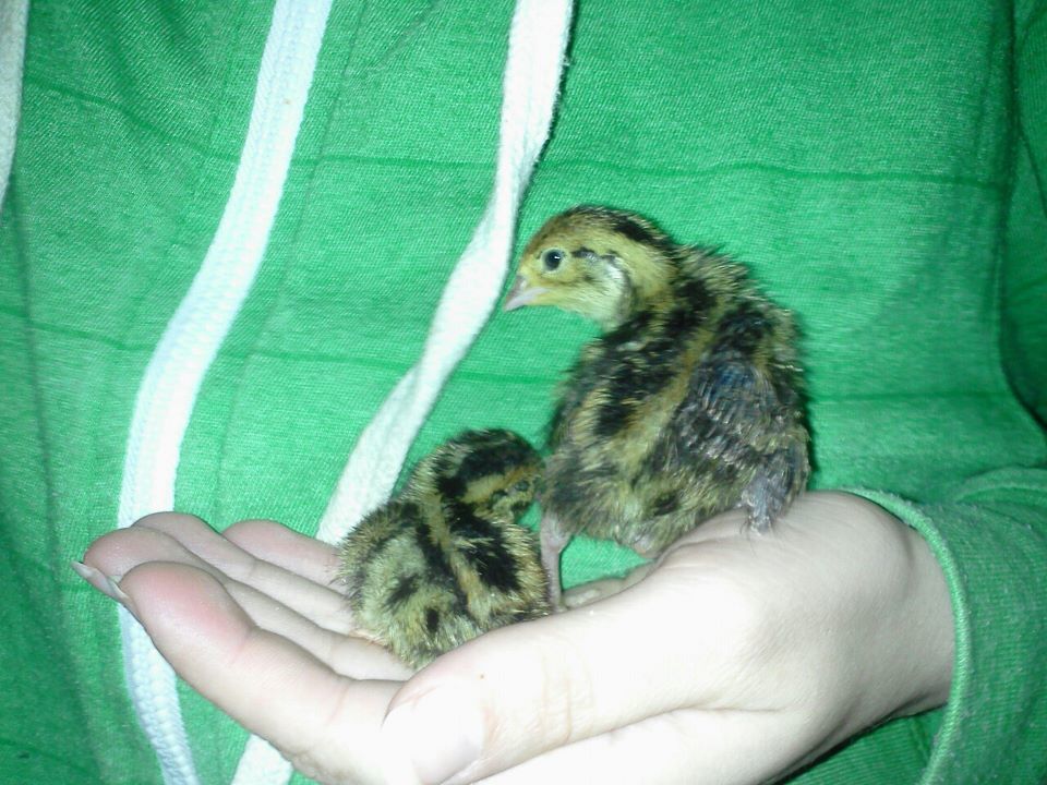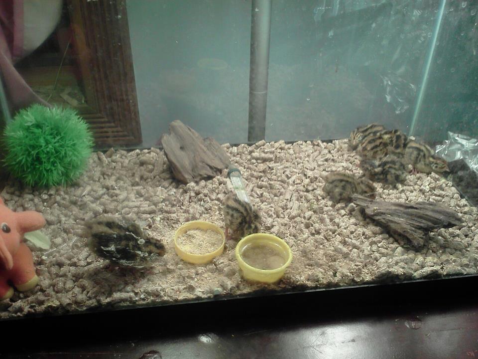 I have taped them flat & wrapped a bit around the ankle to make it harder for it to re curl under it's feet so I'll give it a few days, if it doesn't get straightened out then the best thing for it is to send it off to quail heaven. Have 10 EEs & 1 JB. Here are some photos! The larger quail is only a day-2days older than the other one!!! The second photo is of their little set up till I move them to my 20 gallon tank- when my button quail hatch!(messy front wall because the kids oogle at them thru out the day!)