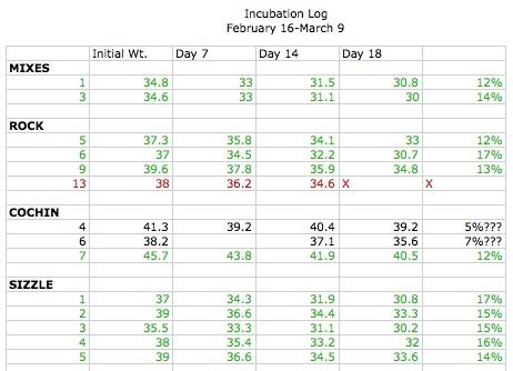 I just weighed/candled everyone and all but two outliers have lost the appropriate amount of weight! The two cochins with weird %'s have perfect aircells though...so I'm thinking something was wonky with my scale during the initial weigh in or...I have no idea.