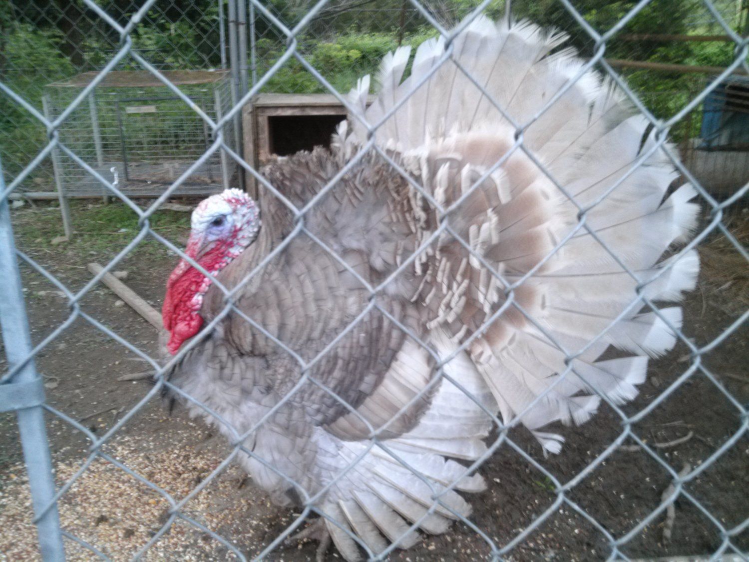 I collected the egg and left a dummy egg in the place to encourage her to lay again there. I'm so excited! Tomorrow is the second birthday of the tom turkey. I hatched him and he was the only one that made it. His feet were curled and we had to do the band aid thing to correct them. He grew into a huge pet. I'd say he's upper 20 to lower 30 pound range. His hen I have him paired with was last springs hatch, and this is the first egg she's laid.
