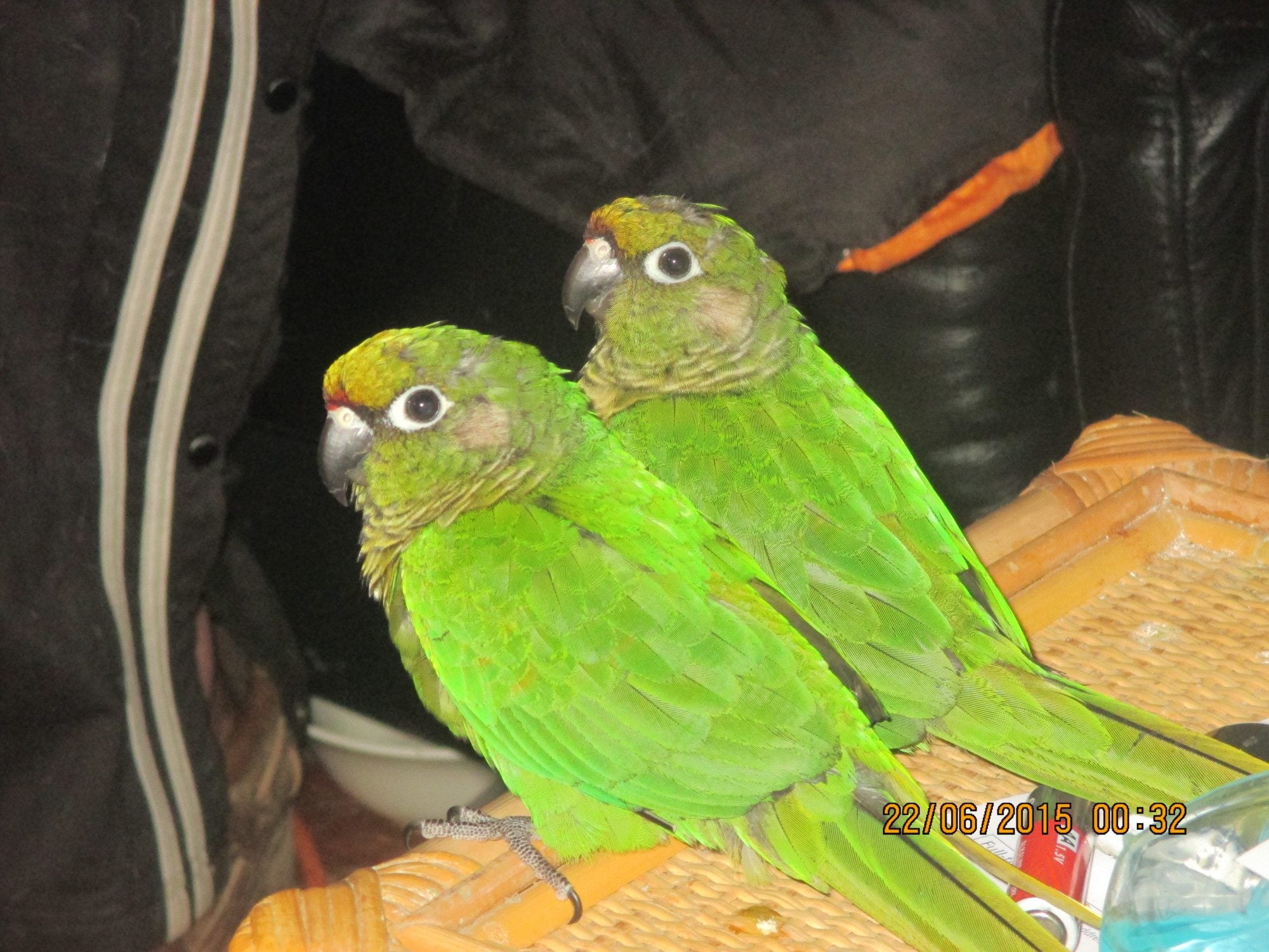 I call them gremlins, because they are. They sleep in their tunnel at night. Its a polar fleece guinea pig tunnel that ive hung horizontally in their cage. They are now 7 months old. and very naughty. Lola is nearest and Frankie at the back. She bosses him around and on occasions she pulls out his feathers on his head. But they are bonded. She is just a madam.