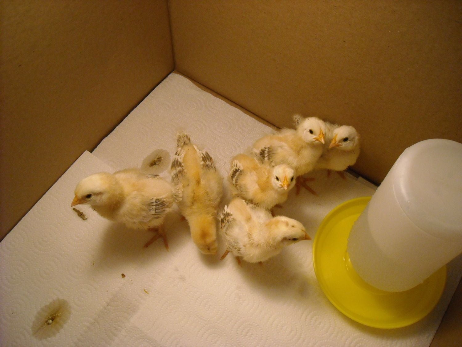 They are a week old in this picture. I am so very pleased with them... They are in the bathroom next to my bedroom, and they are so quiet! Happy little peeping noise. In the past most of the chicks we have brooded in the house have been so NOISY and PEEPing. They are not skittish at all either. Looking forward to seeing them grow up!