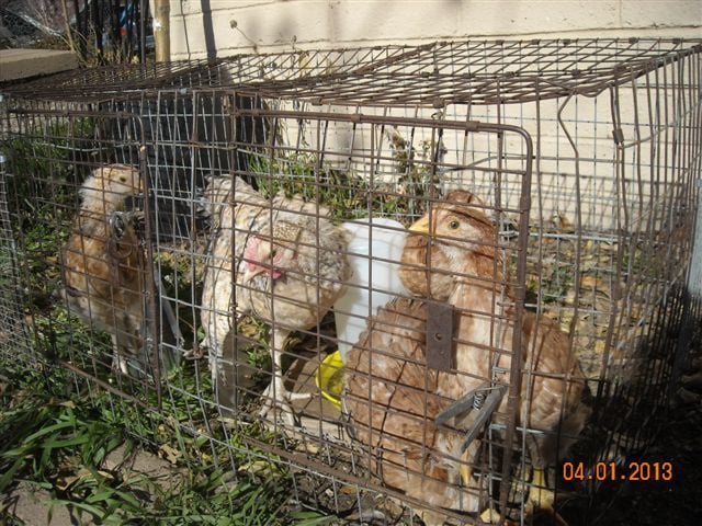 My chicks hatched from eggs from Pastrymama are 7 weeks old. It looks like I have one rooster and 4 hens. I love them! It is hard to get good pictures as they are wanting to be lap chickens! The rooster, not so much, but he is easily picked up. This cage is just a small outside bottomless one that I can move around on the weeds. I still have heat on them at night and on rainy days.