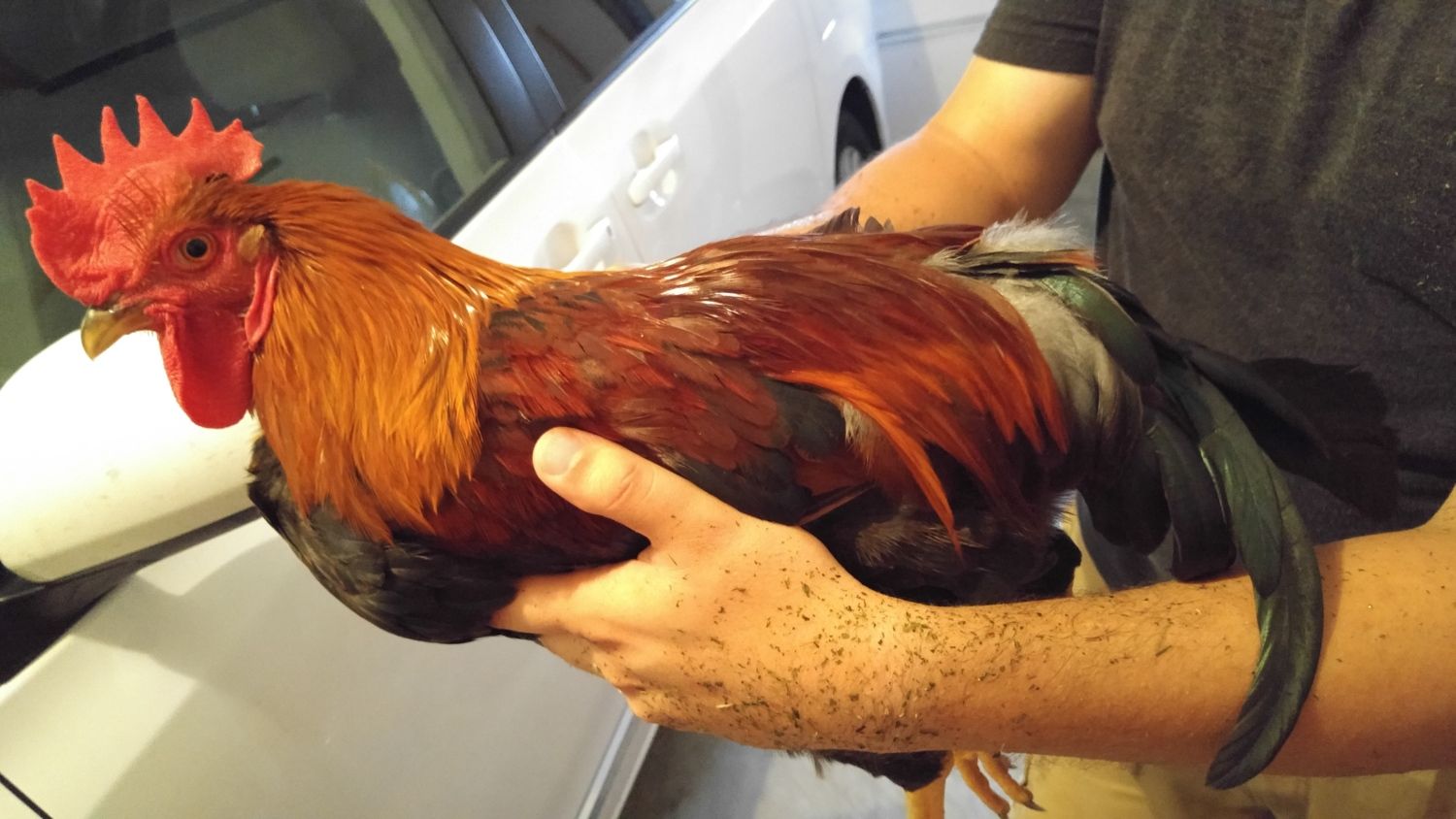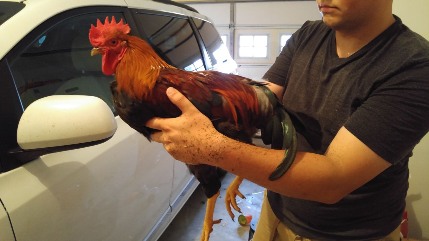 I'm in aberdeen may be interested. Let me talk to my wifeLooking for a good home for my Roo. He is about 5 months old and just starting to come into his prime. He is a Welsummer and was supposed to be a pullet, but hey, things happen. I would love to keep him, but he is starting to get a little more aggressive, nipping at me and clawing my daughter if she doesn't hold him JUST right. From my reading, perfectly normal rooster personality, and in general he is a great bird. He will come with a No Crow collar should you want it, and it does make a huge difference. If I wasn't headed out for a long while, I would keep him, but asking my wife and 4 year old daughter to deal with a rooster alone is just not something I want to do. He can be handled well enough, just not held like the hens and pullets I have can be, which is hard for a 4 year old to really understand. If interested, please let me know, I live in Aberdeen, MD he is free. Should he not find a good home soon, I fear he will go the way of the last 8 cockerels I had.![]()
