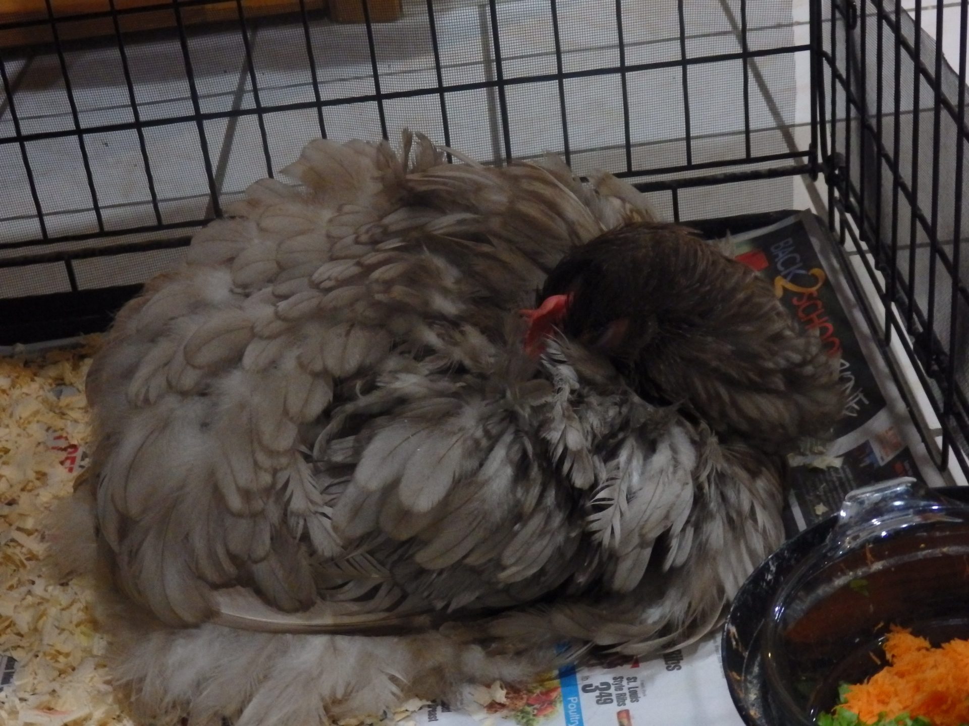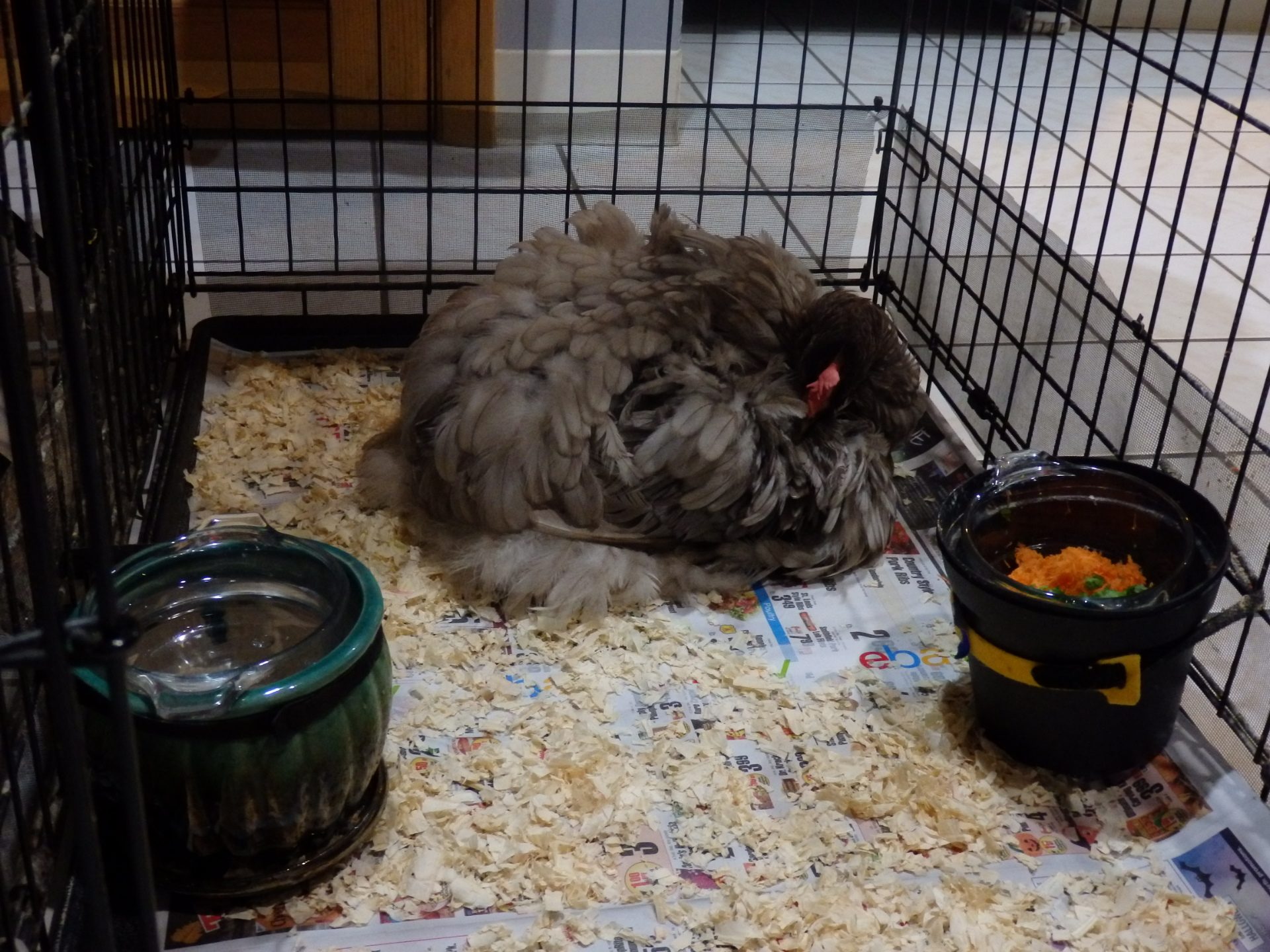 We have had a mauve orpington who is just over a year old. Something not related to the issue I'm about to present but I think it should be mentioned. She has a neurological disorder where she either can't see, or can see but doesn't know what to do with the signal. We pretty much have treated her she if she were blind and hand fed her from a baby chick to a full blown chicken. I mentioned that because she stays in a large dog cage and I have her food and water strategically in fixed spots where she 'knows where they are'. Now the issue is that about a month ago she stopped laying. She started losing massive amounts of feathers but all seemed ok because they were being followed by new'er ones. After that she seemed to have an upset stomach. The poop became white and liquidy and seemed to have visible small pieces of shredded carrots. I started noticing that she was losing her appetite and losing some weight. She would eat just the shredded carrots that I would give her before going to work only to come back and see she has not touched the feed at all, very unusual. This past week it seems she has lost some significant weight and lost interest in drinking and eating. I took her to the vet on Thursday 10/06, the Dr. said that her crop seemed a bit swollen. She took a blood sample to check if she has lead poisoning. We were prescribed Metoclopramide 8mL twice each day. By this time our chicken had been very lethargic, sleeping standing up and seemed fatigued. Strange turn of events we had to take her in again for another blood sample as the first one could not be processed for some reason. On the second visit the Dr. put a swab down her throat and looked at it under the microscope. She said the crop usually has bacteria but hers seems just a tad bit elevated. This is when the Dr. also gave us anti-biotic Tribriseen a small amount per day. Our chicken did show some interest in eating a boiled egg this morning. She responds to her favorite sound, the shredding of the carrots, and tried to peck at it, but for some reason just sits back down again and closes her eyes trying to sleep. We have been massaging her crop regularly. Please see attached pictures, she has preferred this sleeping positing recently, face shoved in her wing with neck turned. Tonight we are going to try to give her some cooked oatmeal. Based on the symptoms I just wanted an opinion what exactly is going on with her. If she keeps rejecting food like this I'm not sure how long she might last. Would like to know if there are any success stories out there.