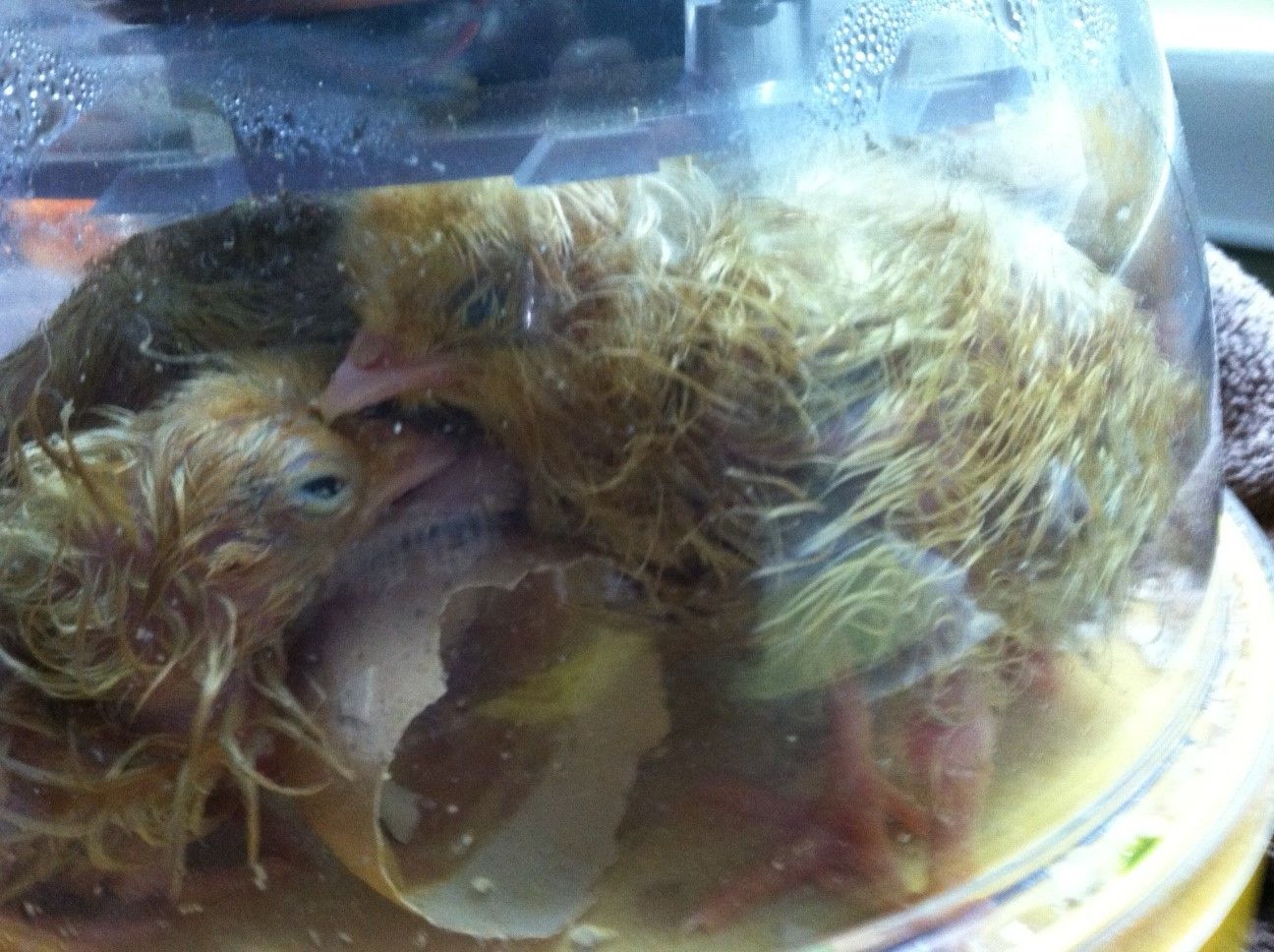 I would put them in a box lined with paper towels under a light. Let them dry out. They won't dry out in that tropical dome. Just make sure to keep them warm and out of drafts until they are fully fluffy.Hello all,
