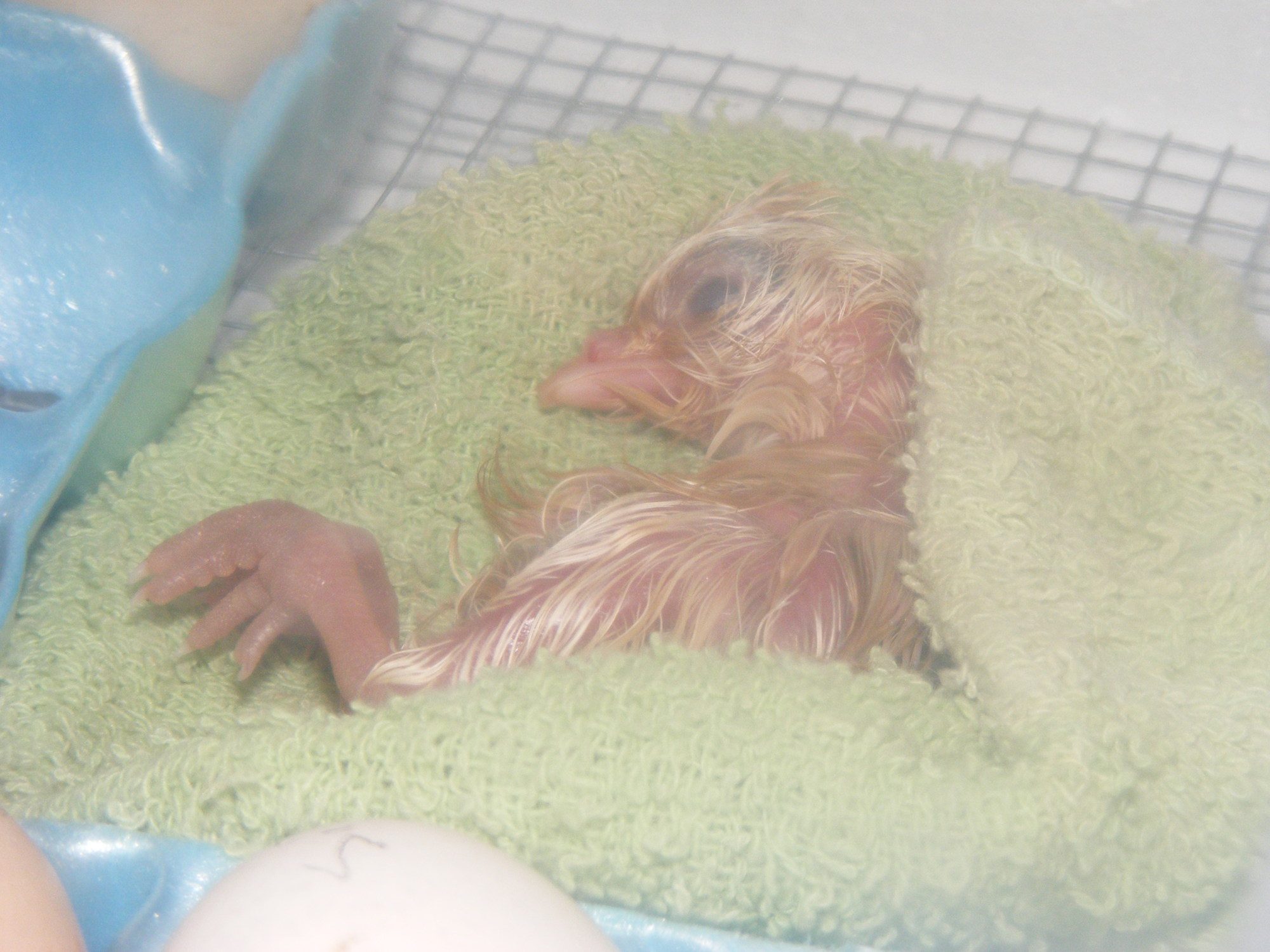 It was so weak it layed like this for hours. But a lot of patience and sav a chick, this is Fidel/Fifi at 12 hrs old. Still a little weak, not eating or drinking much yet, but very lively. Already getting the Polish crest! It was almost 2am before I got to sleep, then woke up with and earache. I despise them as much as a toothache!!!