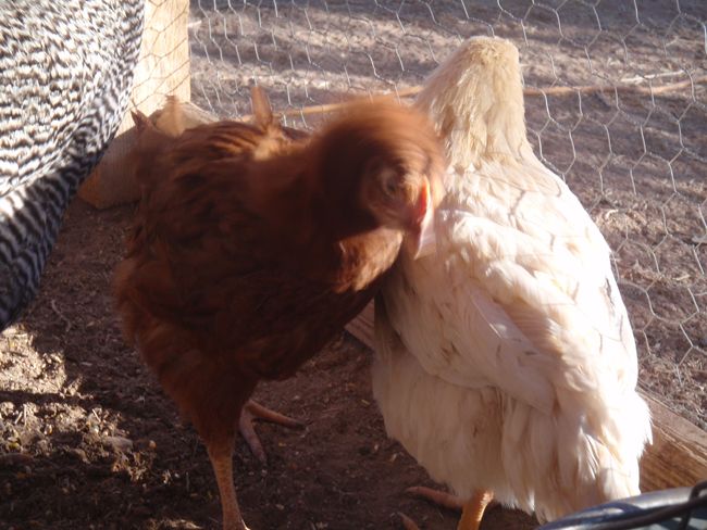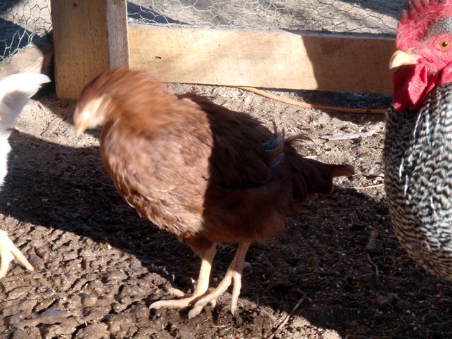 My dad gave me his two McMurray "exotic" breeds from his order. Anyone know what breeds these two are? The pictures aren't great, but the best I could get today. The red pullet in the background of the first picture is the same one in the other pics.